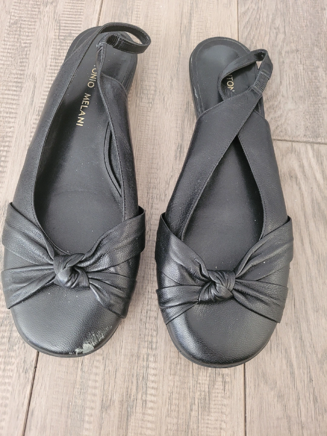 Antonio Melani Black Leather Slingback Sandals - Size 7 Selling a pair of Antonio Melani slingback sandals in size 7. These are black leather sandals with a knotted detail on the front. They show some signs of wear, but still have lots of life left!