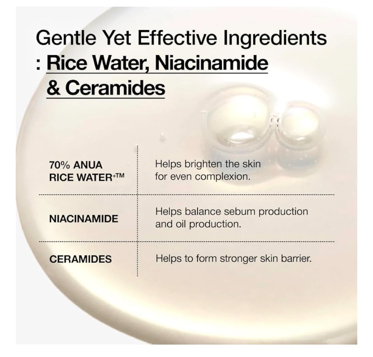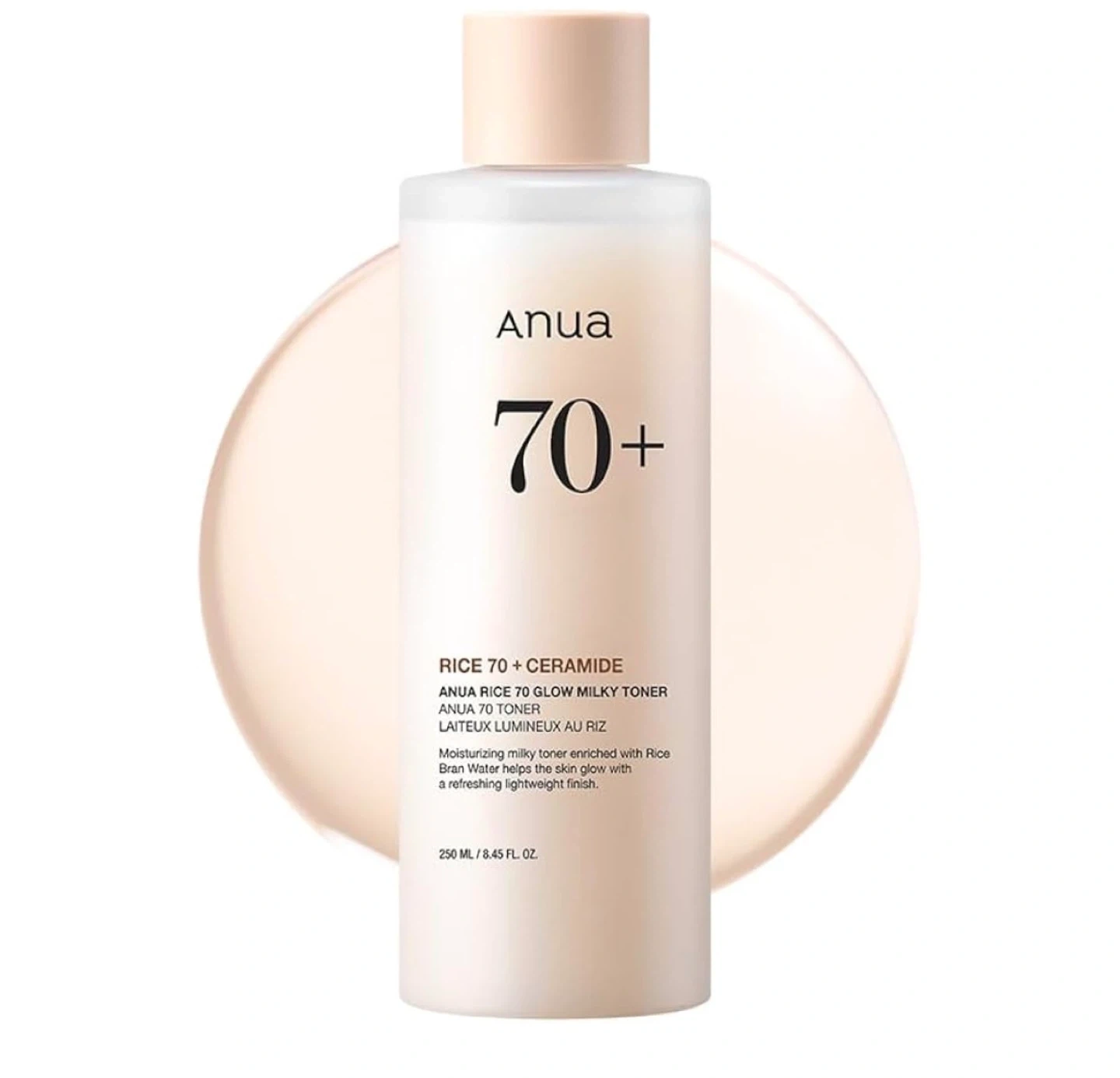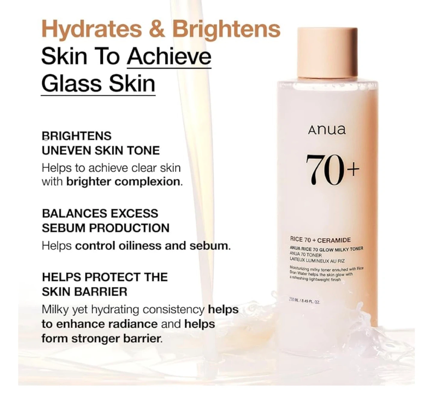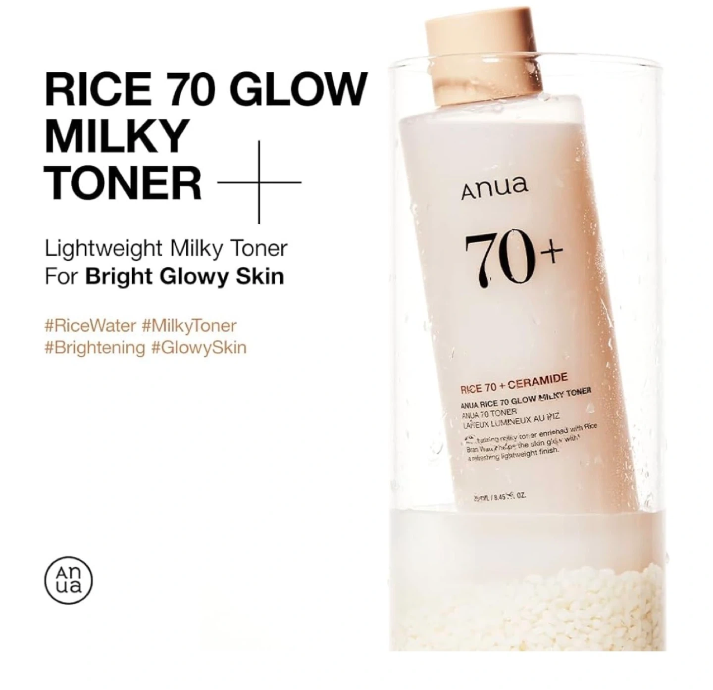 65Get that bright, glowy skin with the Anua 70+ Rice Glow Milky Toner! This lightweight milky toner is enriched with Rice Bran Water to help the skin glow with a refreshing lightweight finish. It helps brighten uneven skin tone and balances sebum production. It also helps protect the skin barrier with its milky yet hydrating consistency, enhancing radiance and helping form a stronger barrier. Size is 250ml/8.45 fl oz