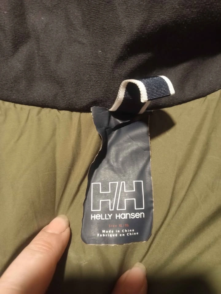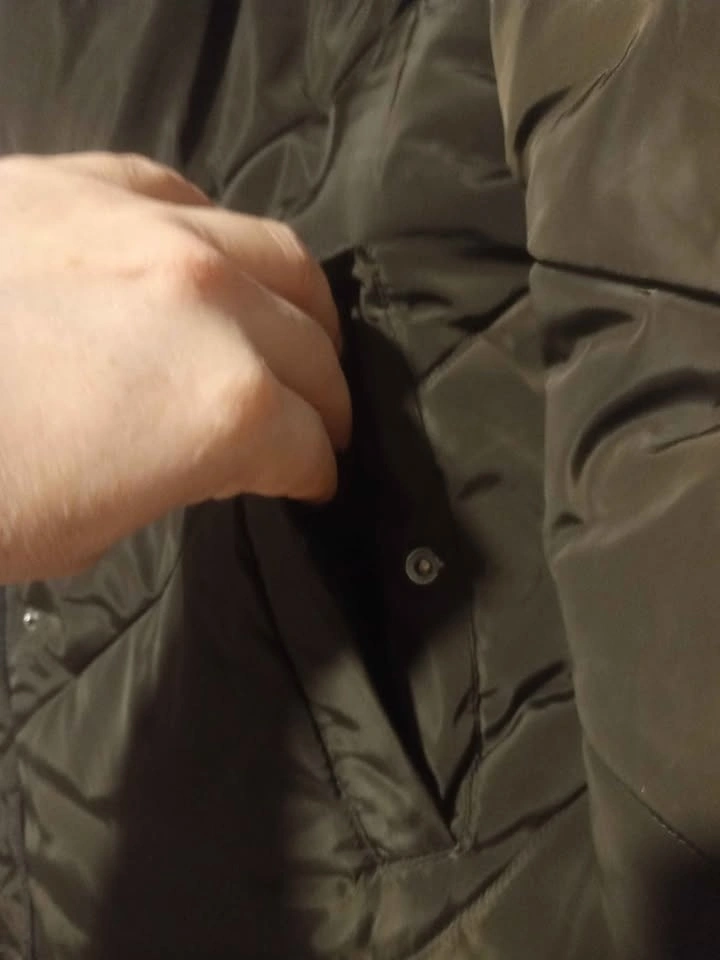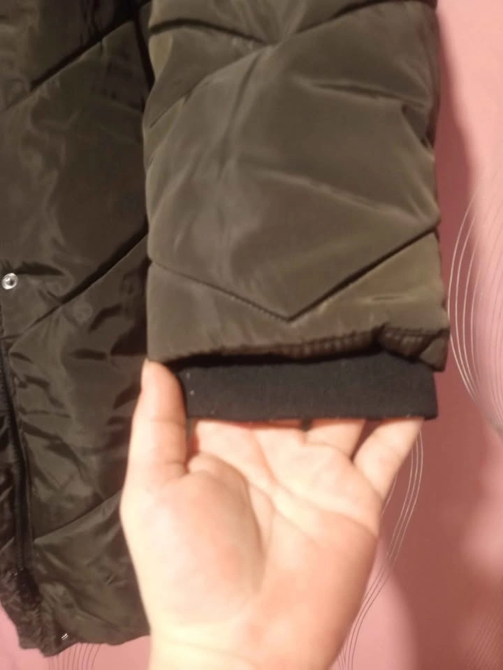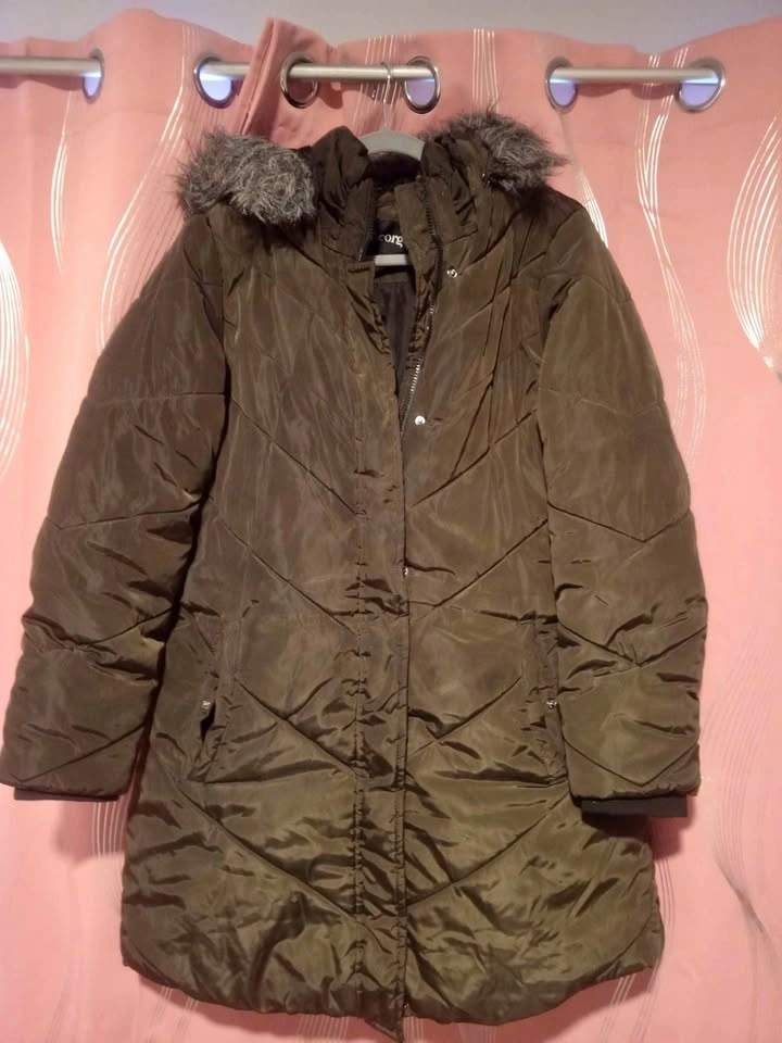 Warm winter coat in olive green, Size XL. Features: