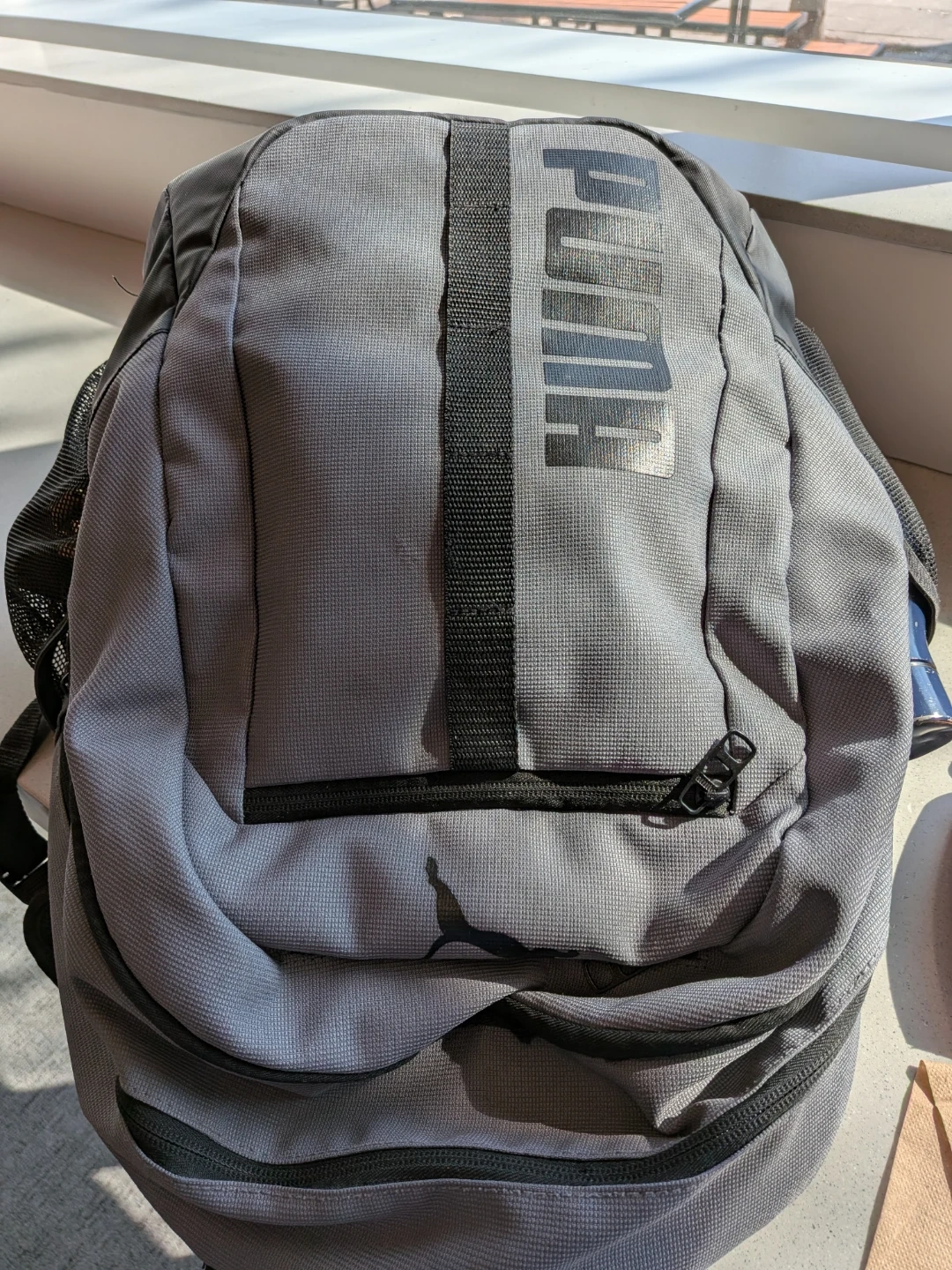This is a grey backpack with the Puma logo. It's made of durable fabric with multiple zippered compartments. Side mesh pocket included.
