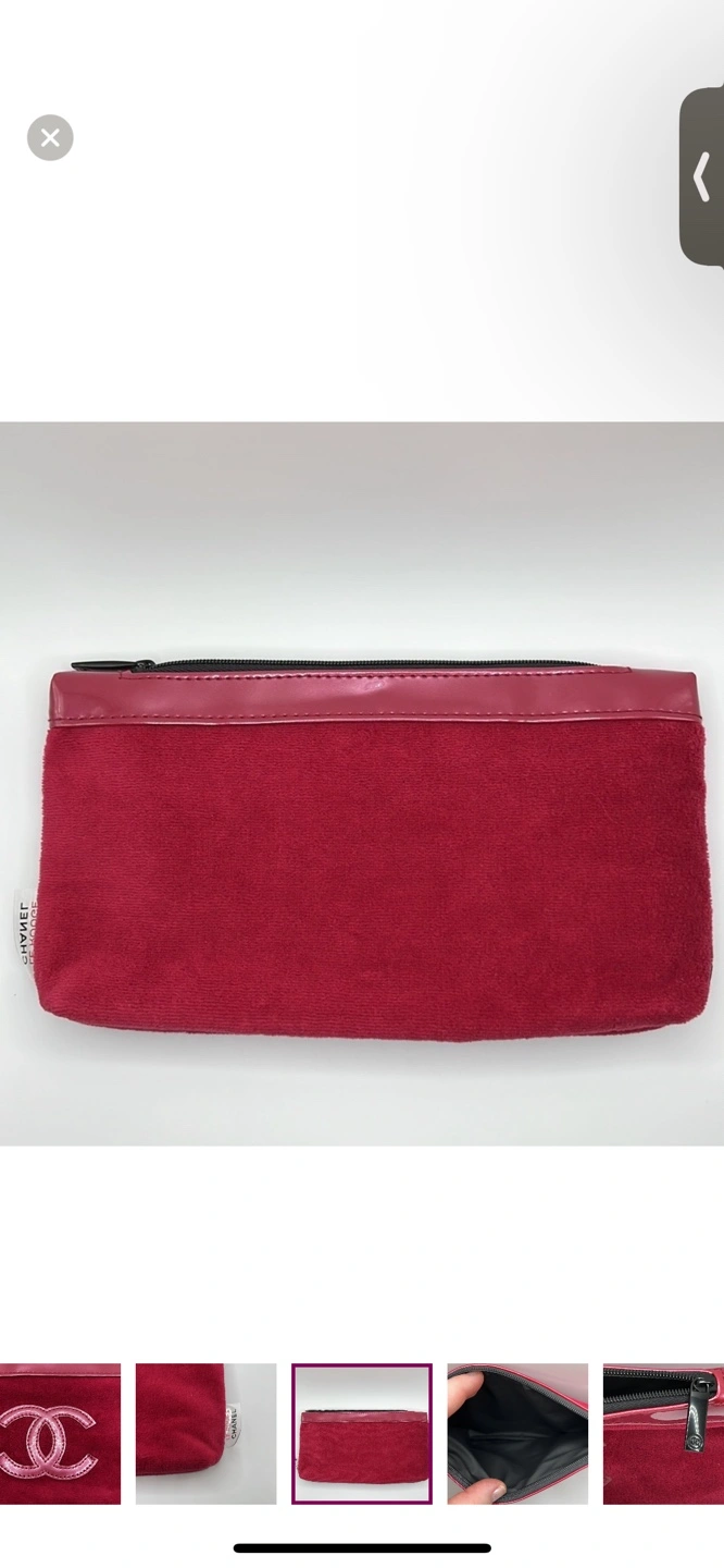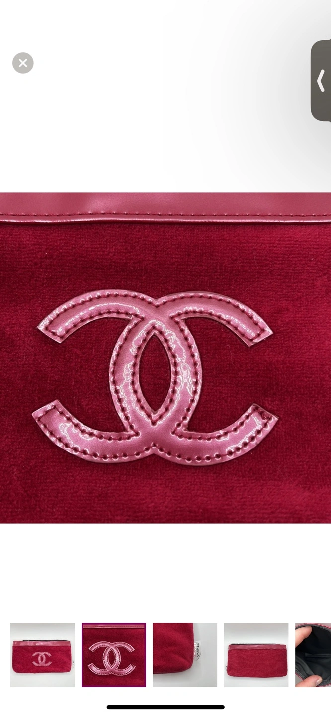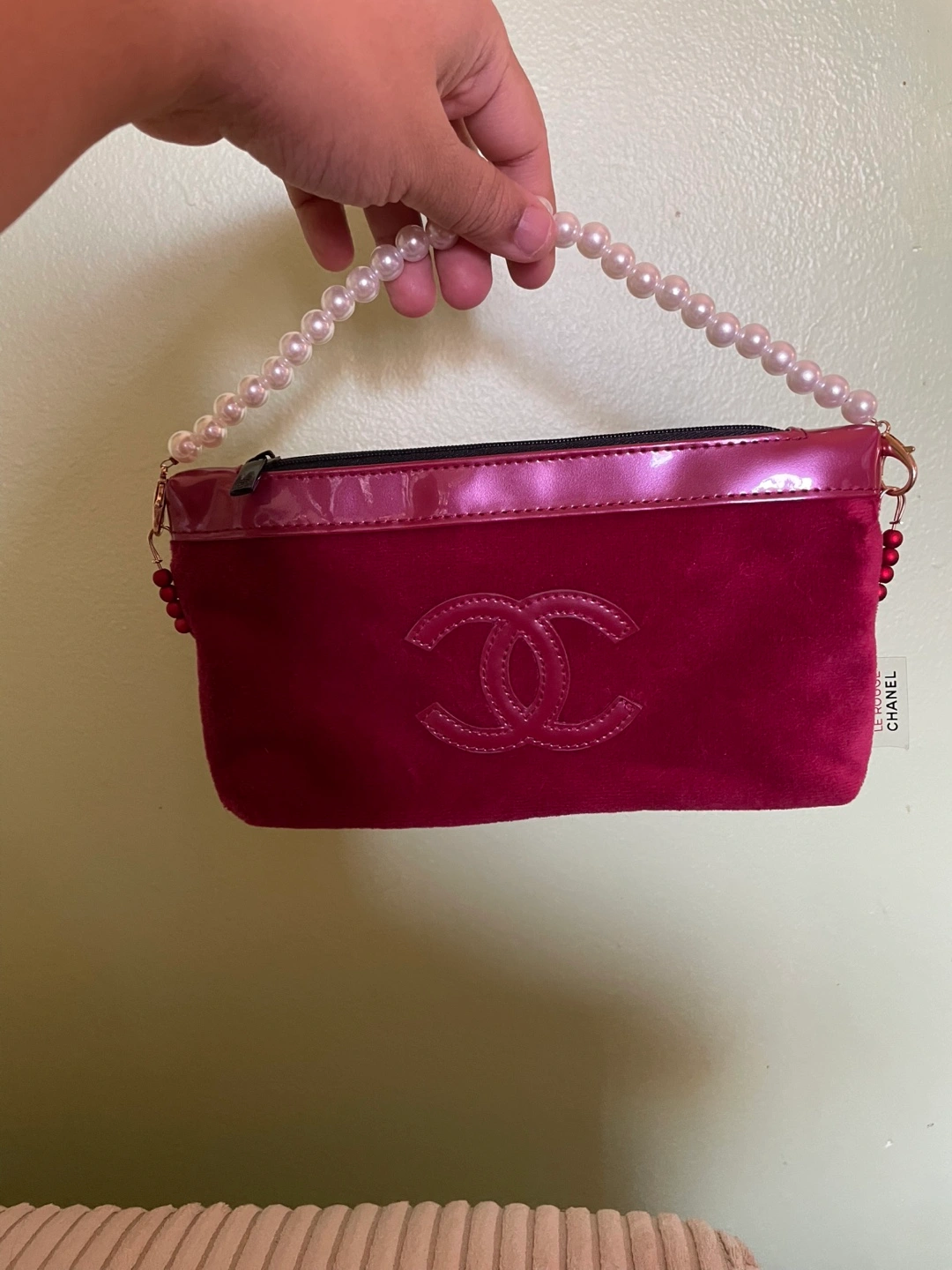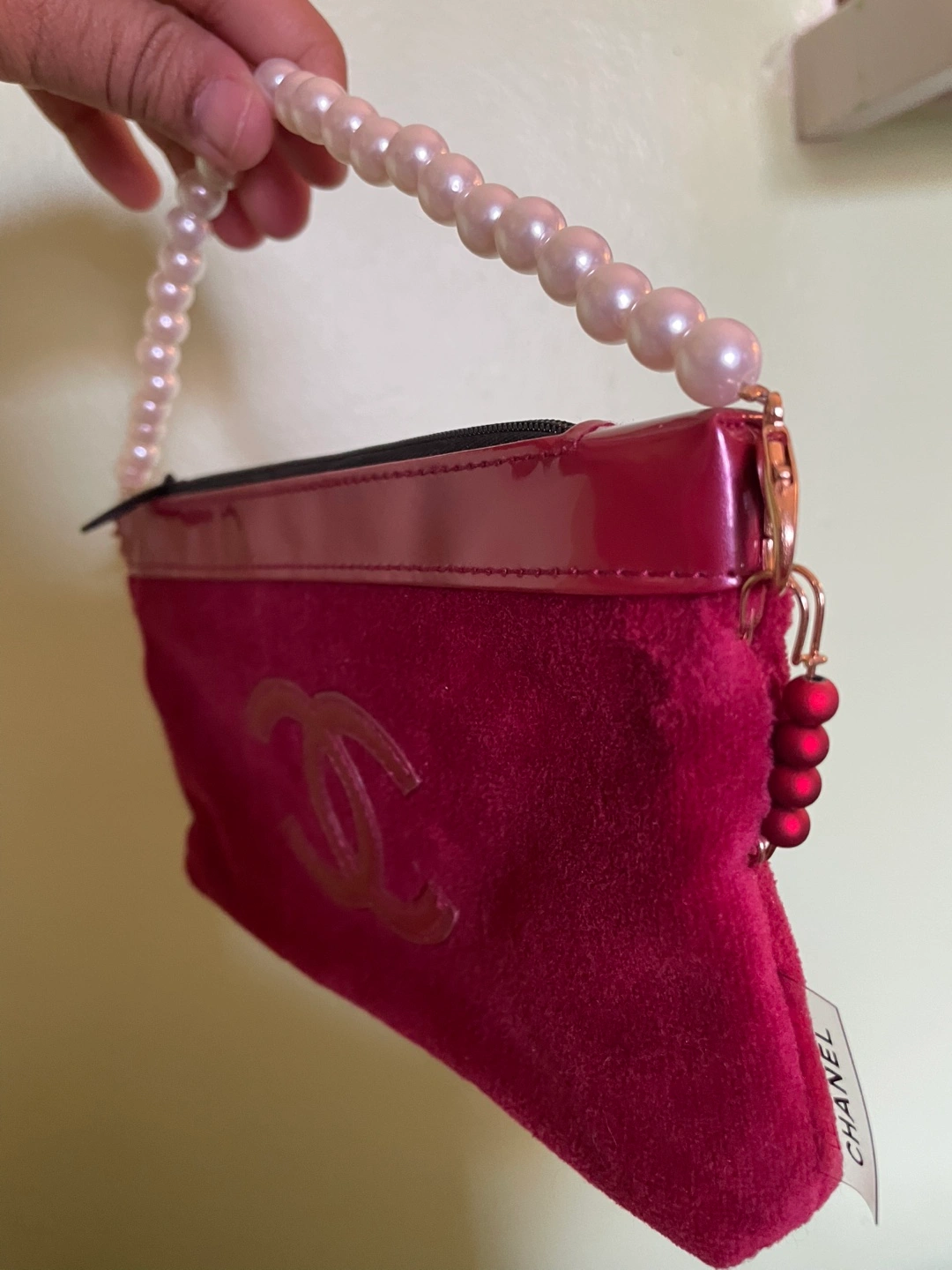 Red velvet Chanel makeup bag. Features a zipper closure and iconic Chanel logo. Great for travel or everyday use. Can convert it into a handbag with unbranded pearl pins and strap as seen in last pic. No extra charge for converting.