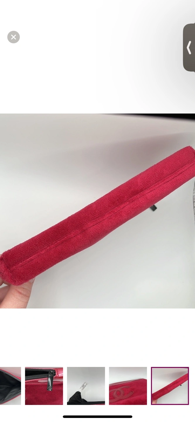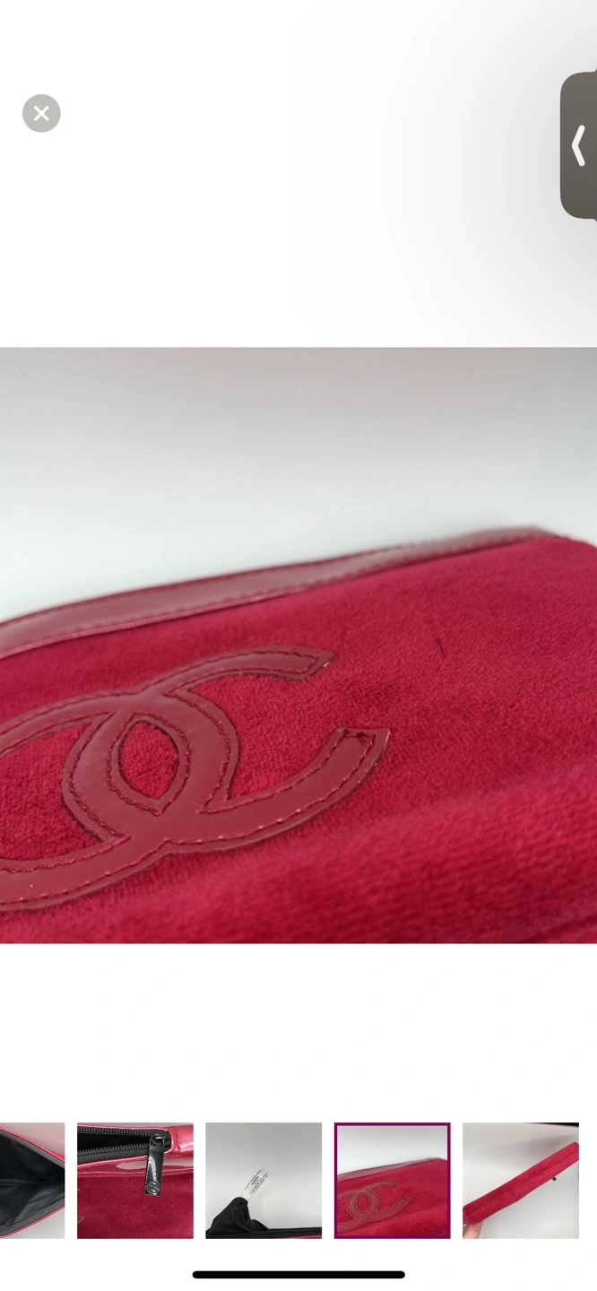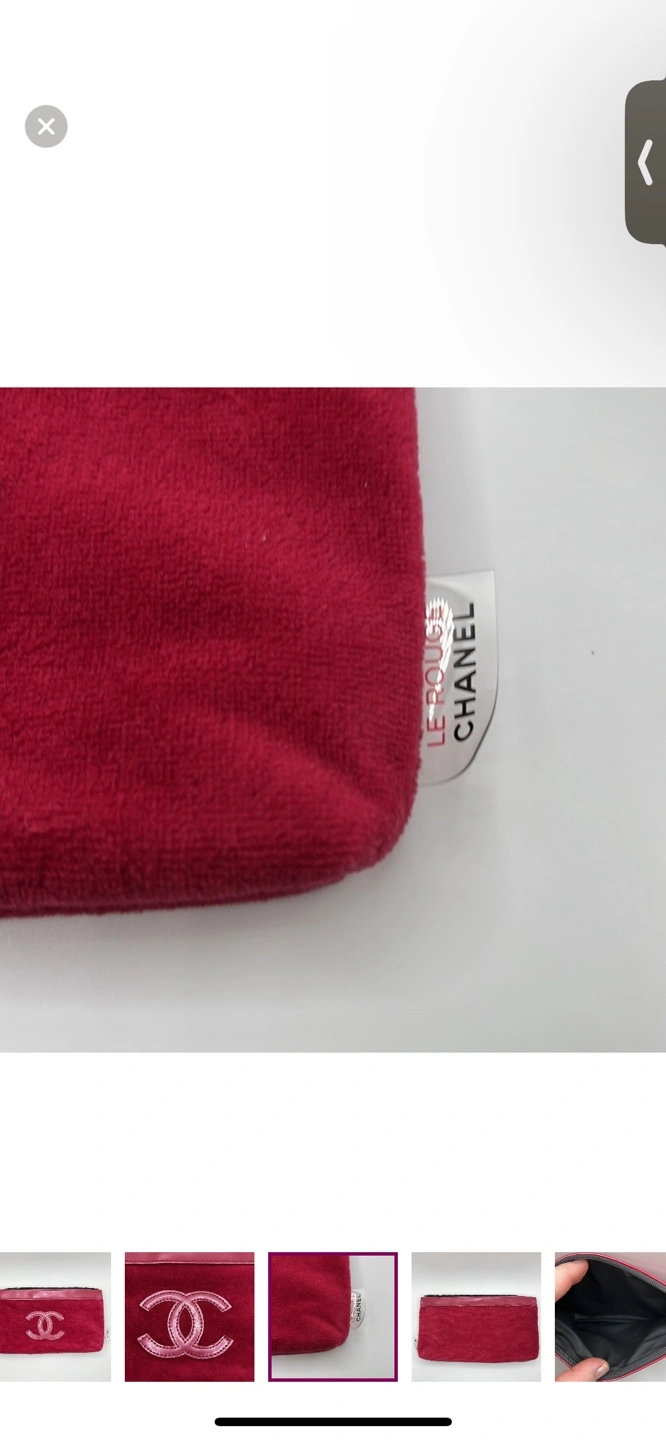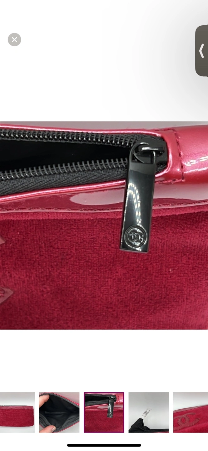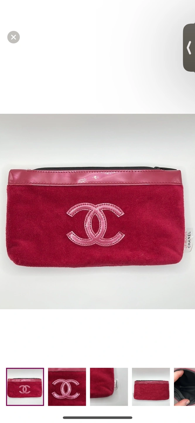 Red velvet Chanel makeup bag. Features a zipper closure and iconic Chanel logo. Great for travel or everyday use. Can convert it into a handbag with unbranded pearl pins and strap as seen in last pic. No extra charge for converting.