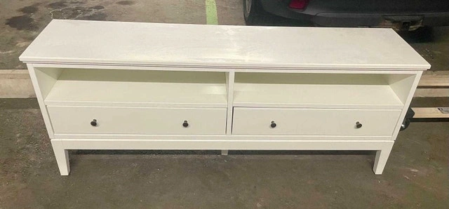 Excellent condition. Solid wood. A few minor scratches from normal use and moving. The IDANÄS series combines timeless design with modern functionality. Keep the area around the TV tidy – store your games, controls and accessories in the two drawers and feed the cables through the outlets in the back. Create a coordinated home by combining this TV-bench with other furniture from the IDANÄS series. Adjustable feet make the TV bench stand evenly on an uneven floor. The drawers close silently and softly, thanks to the integrated soft-closing function. Cable outlet for easy cable management.