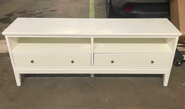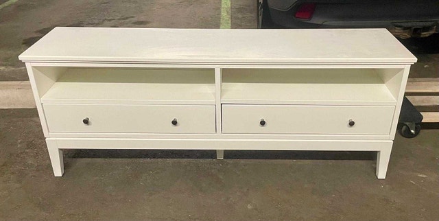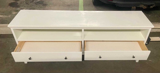 Excellent condition. Solid wood. A few minor scratches from normal use and moving. The IDANÄS series combines timeless design with modern functionality. Keep the area around the TV tidy – store your games, controls and accessories in the two drawers and feed the cables through the outlets in the back. Create a coordinated home by combining this TV-bench with other furniture from the IDANÄS series. Adjustable feet make the TV bench stand evenly on an uneven floor. The drawers close silently and softly, thanks to the integrated soft-closing function. Cable outlet for easy cable management.