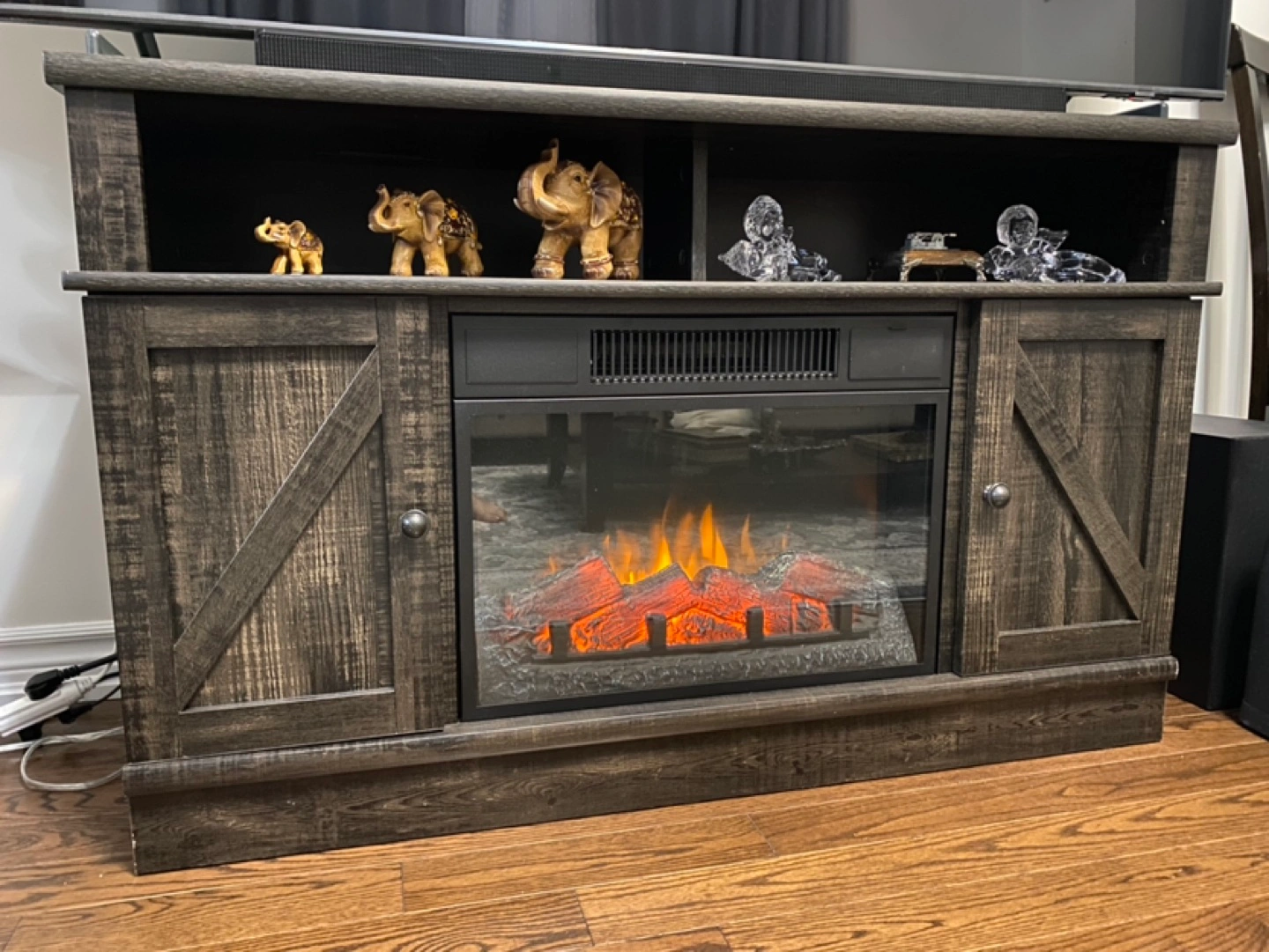 The Textured, smoked rough-sawn oak laminate finish tv stand. Fireplace is barely used. The heater produces up to 4500 BTUs. Dual heat setting - 750W and 1500W