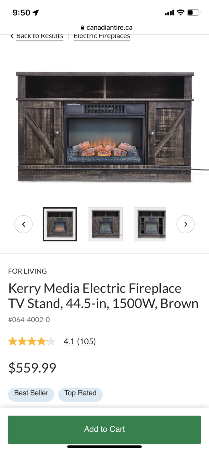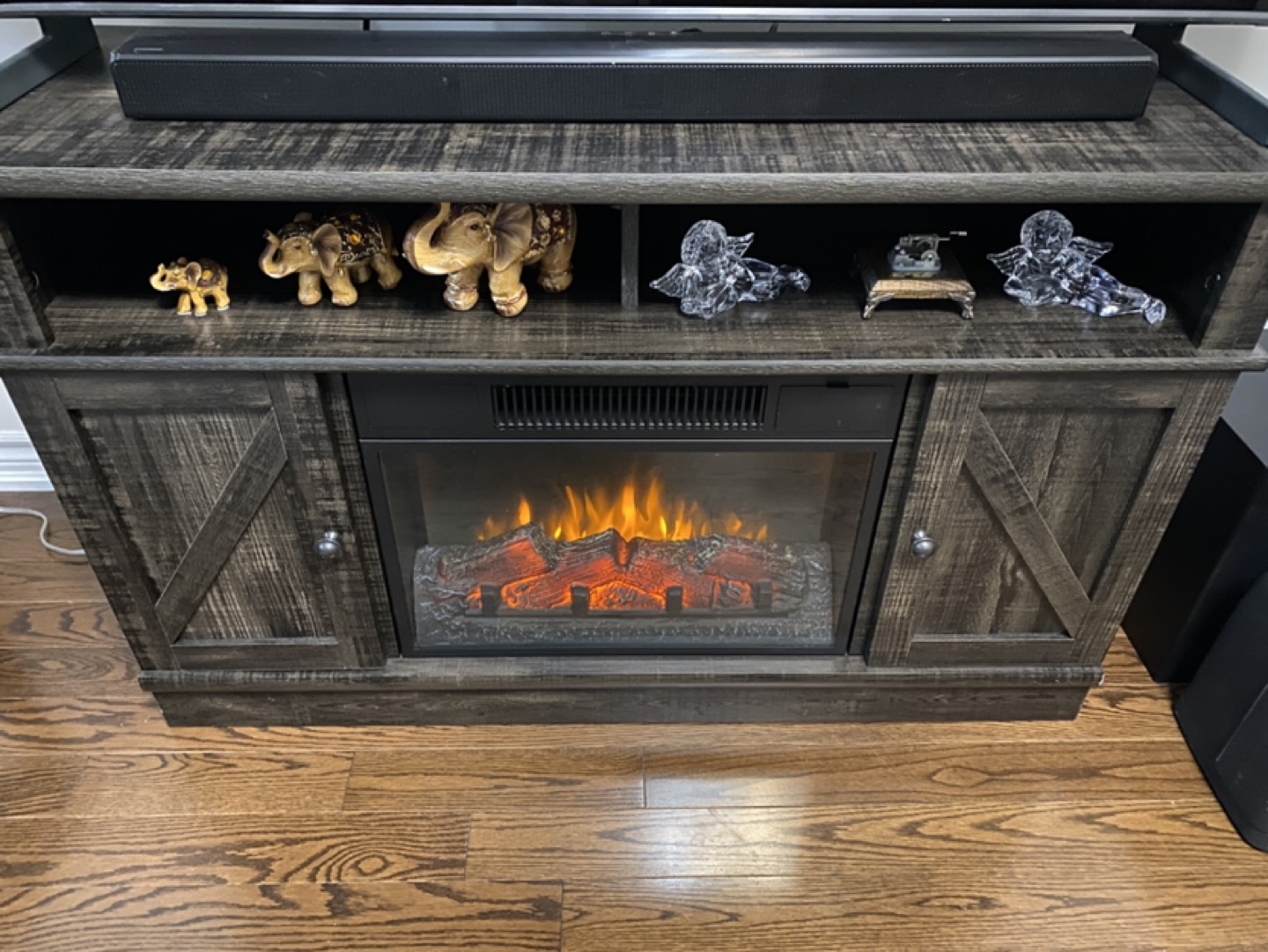 The Textured, smoked rough-sawn oak laminate finish tv stand. Fireplace is barely used. The heater produces up to 4500 BTUs. Dual heat setting - 750W and 1500W