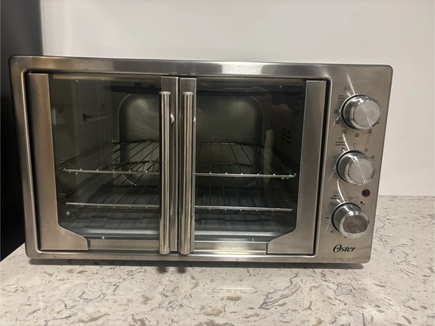 This Oster toaster oven is stainless steel with a glass door. It features multiple rack positions and temperature controls. It's perfect for toasting, baking, and broiling.