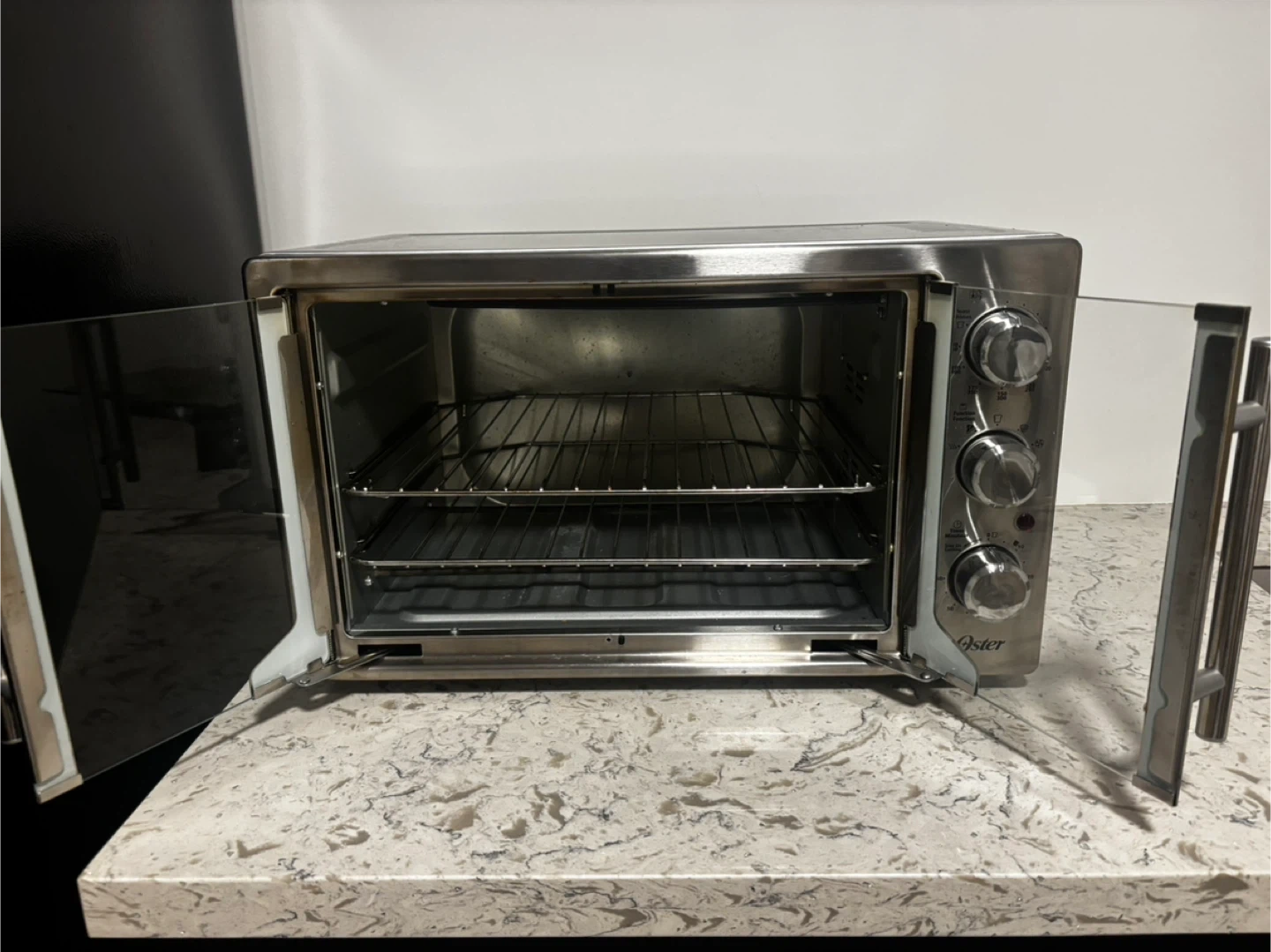 This Oster toaster oven is stainless steel with a glass door. It features multiple rack positions and temperature controls. It's perfect for toasting, baking, and broiling.