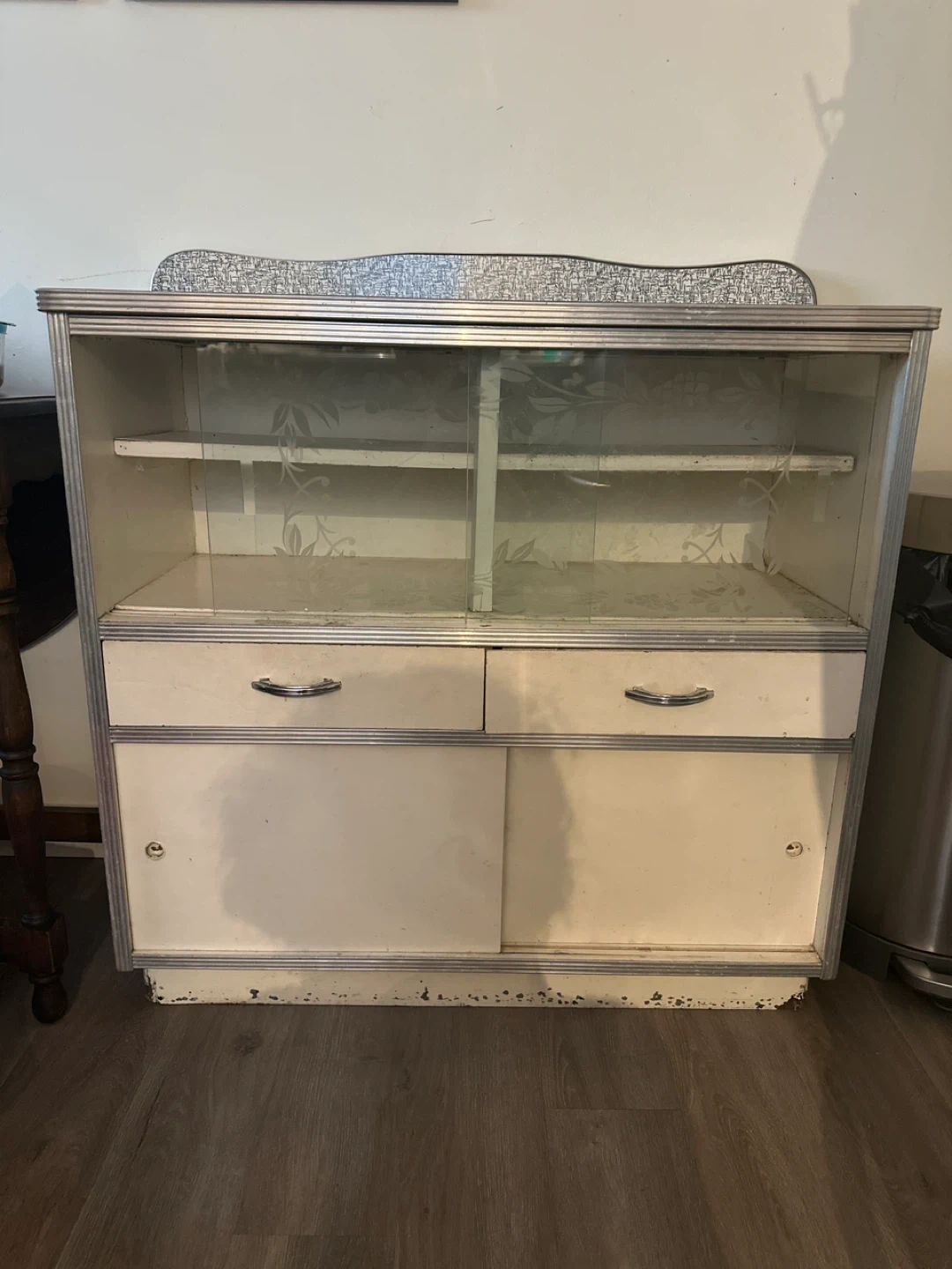 This vintage display cabinet features a glass front with sliding doors and two drawers. It's a great piece for storing and showcasing items. It could use a little TLC as it’a been well used, but it’s solid and with a face lift will be a great addition to any home, shop or even workshop.