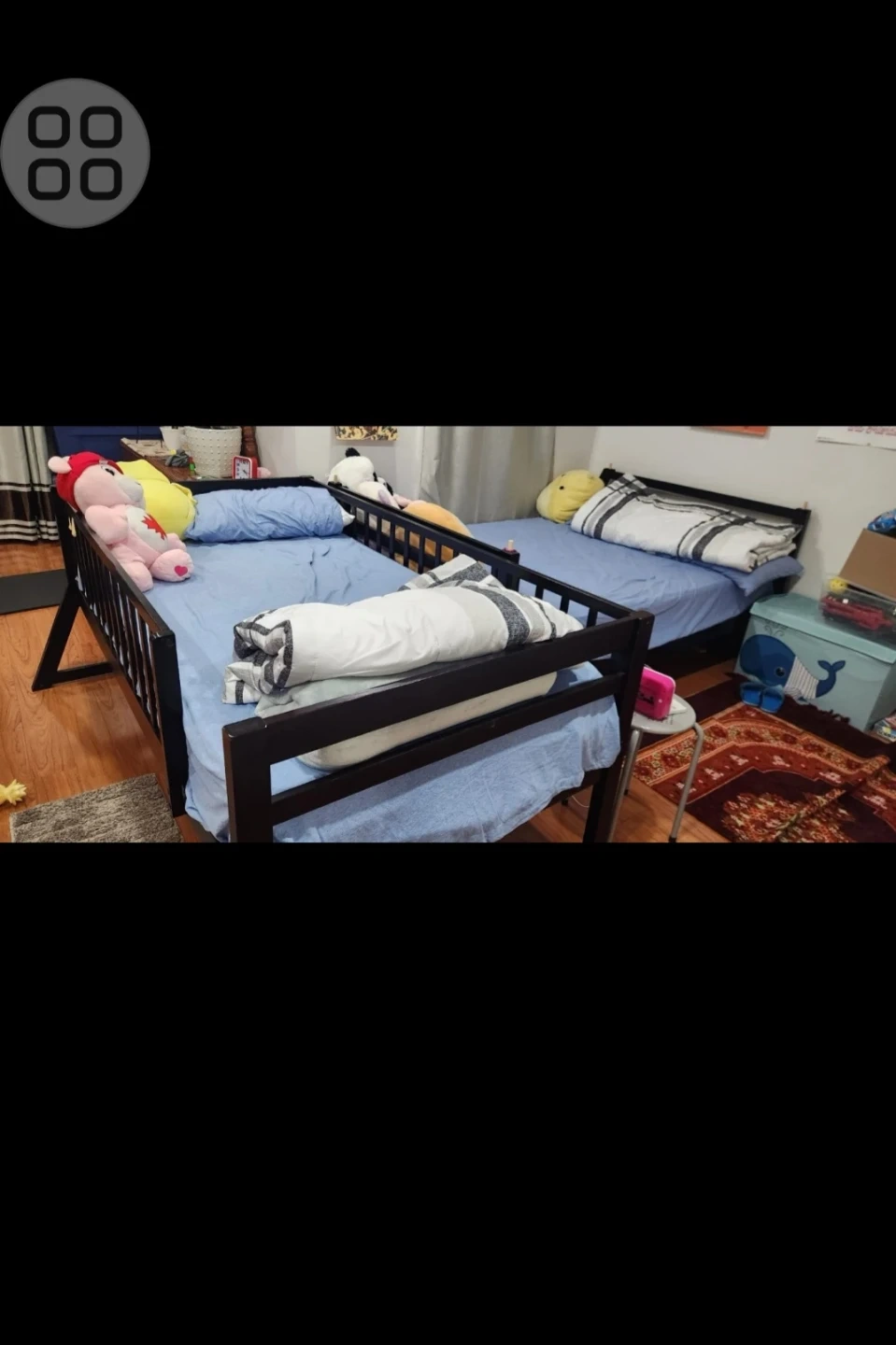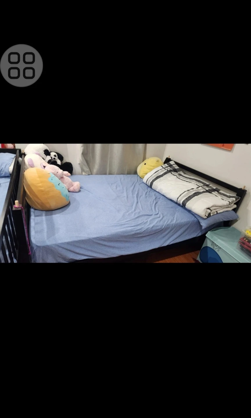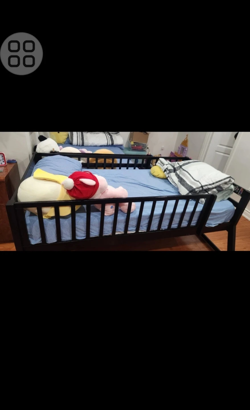Dark wood bunk bed with ladder access. Features storage drawers built into the base. Perfect for maximizing bedroom space for kids or guests! 905 965 1167