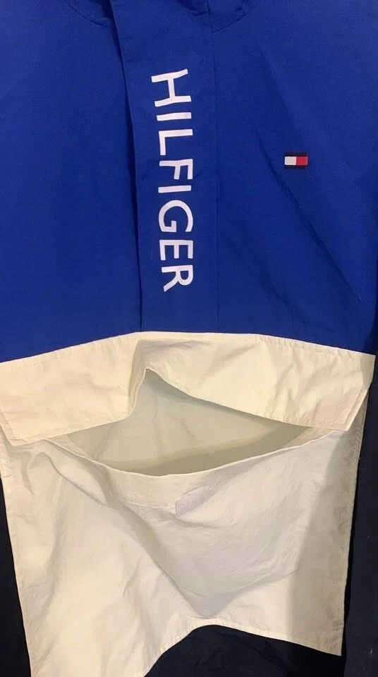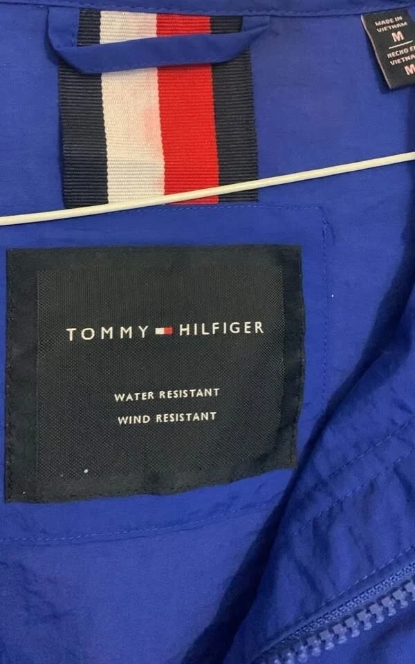 Tommy Hilfiger windbreaker jacket brand new w tags. The jacket is a size medium and features a stylish colour block design with blue, black, and white. It's water and wind resistant, perfect for those unpredictable weather days!