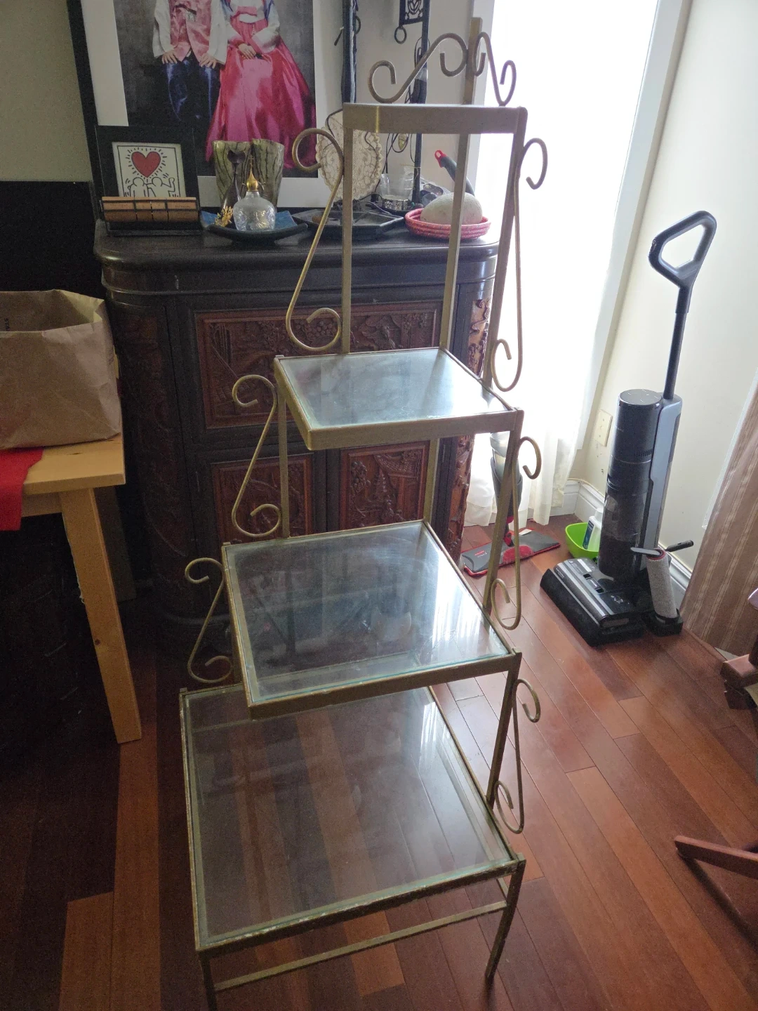 A stylish 3-tier display shelf with a gold-tone metal frame and glass tiers. It's perfect for showcasing plants, decor, or collectibles. The tiered design offers ample vertical display space.