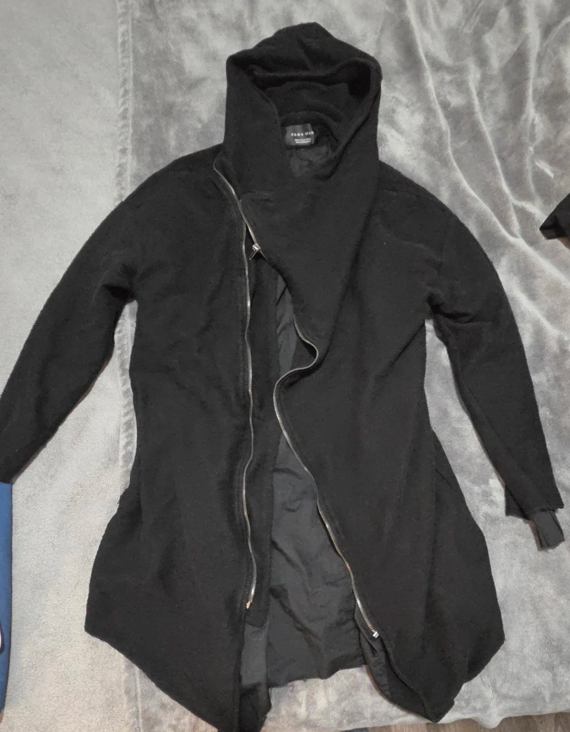 Selling a Zara Man black coat. It features a unique asymmetrical zipper and a high collar. It's in great condition and perfect for cooler weather!