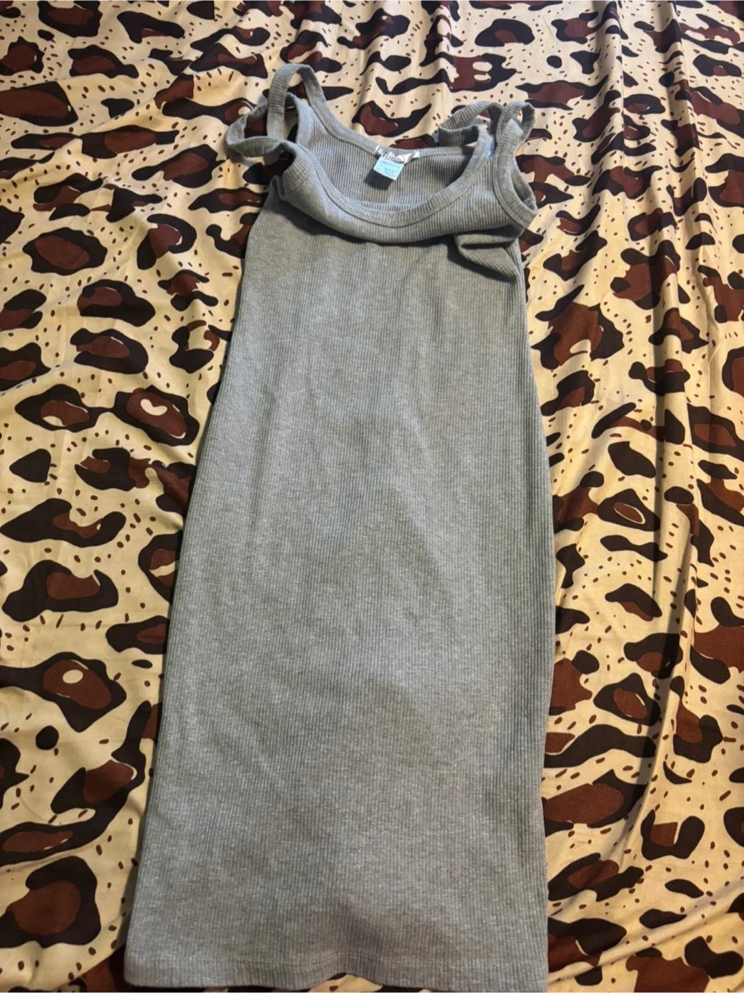 This is a ReVamped grey ribbed tank dress. It's a size medium. Made in Bangladesh. It's a comfy, stretchy material.