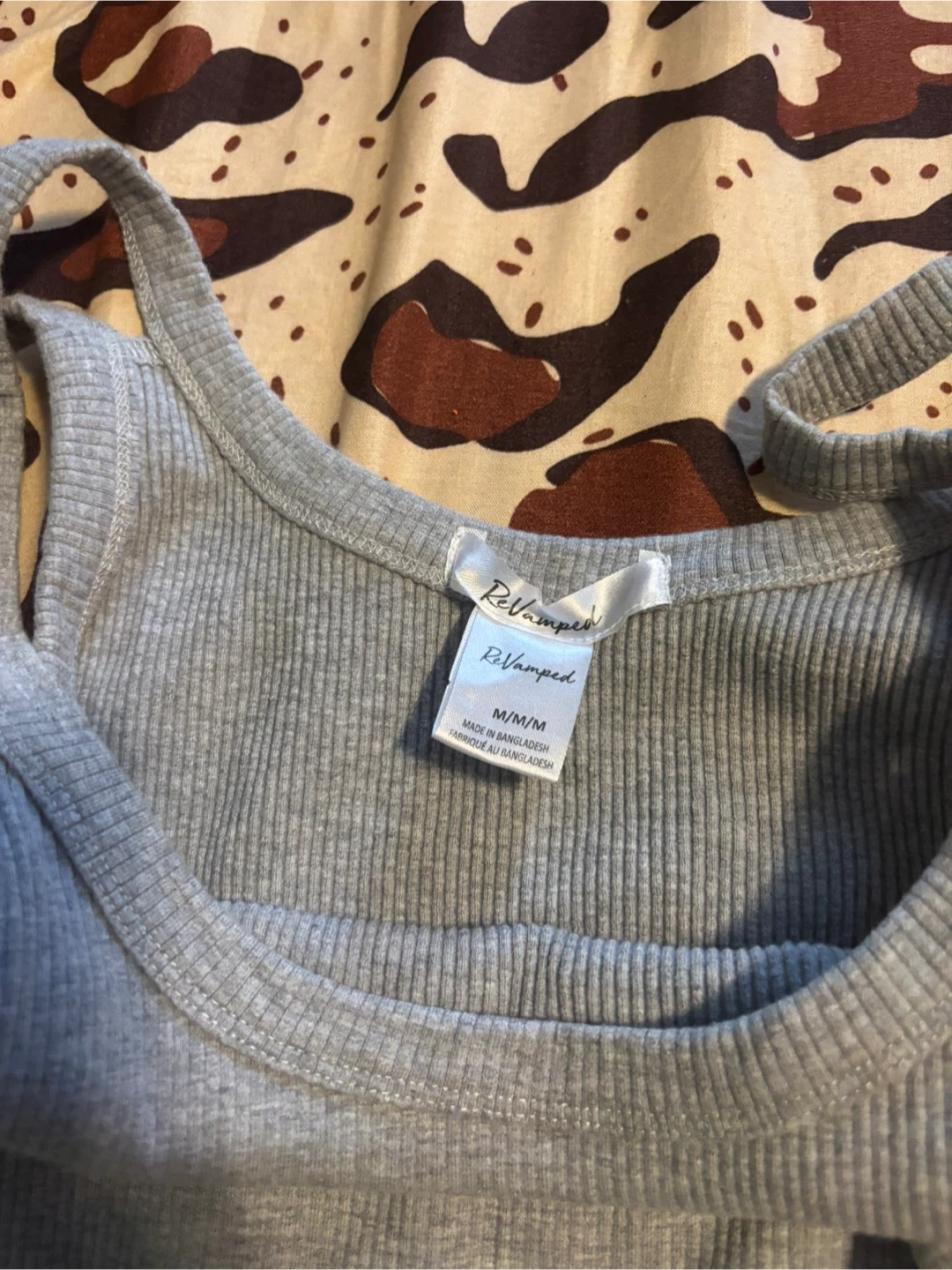 This is a ReVamped grey ribbed tank dress. It's a size medium. Made in Bangladesh. It's a comfy, stretchy material.