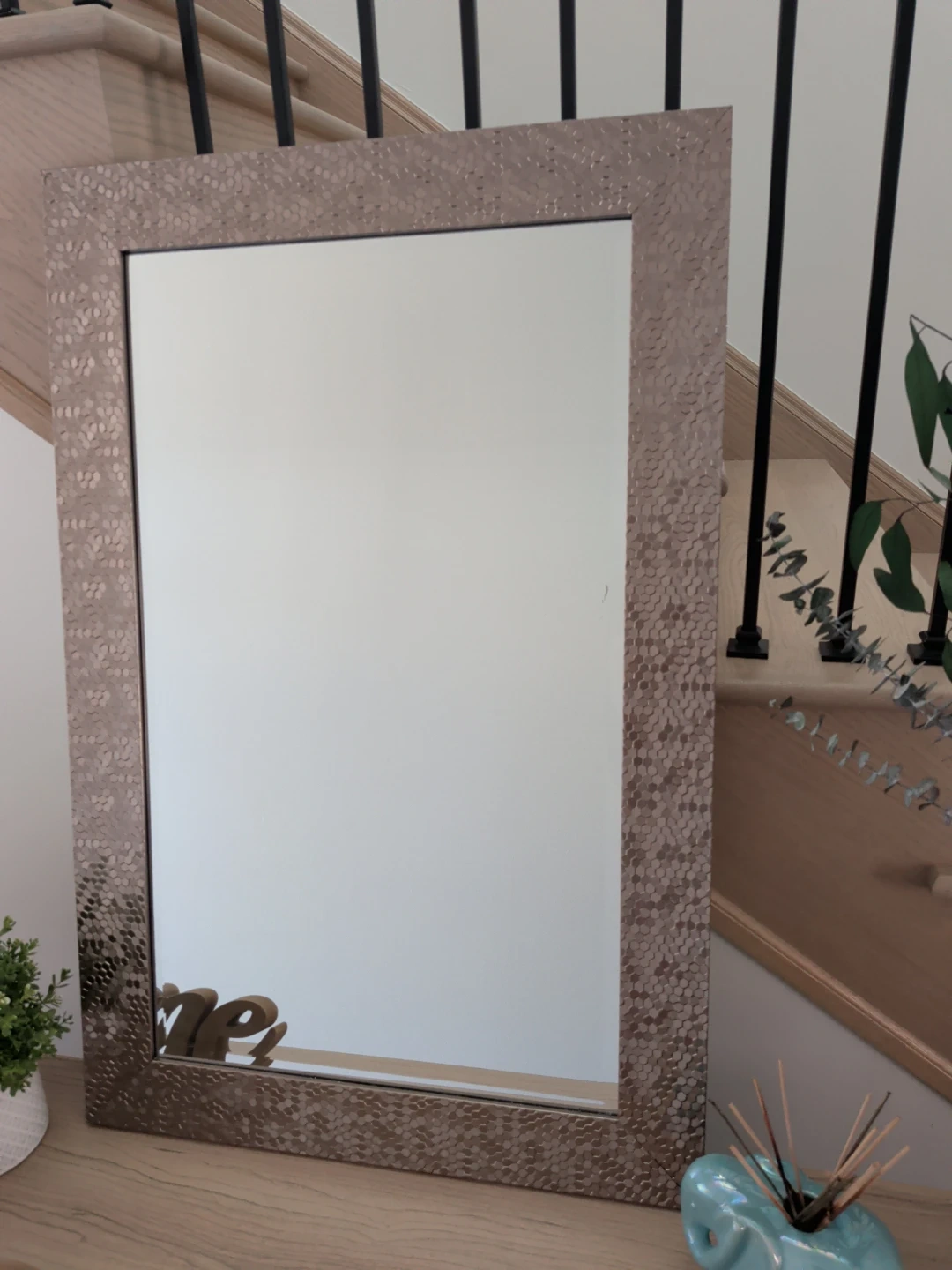 A decorative wall mirror with a textured frame. Its frame is a champagne or light bronze colour with a subtle embossed pattern. It's perfect for adding a touch of elegance to any room.