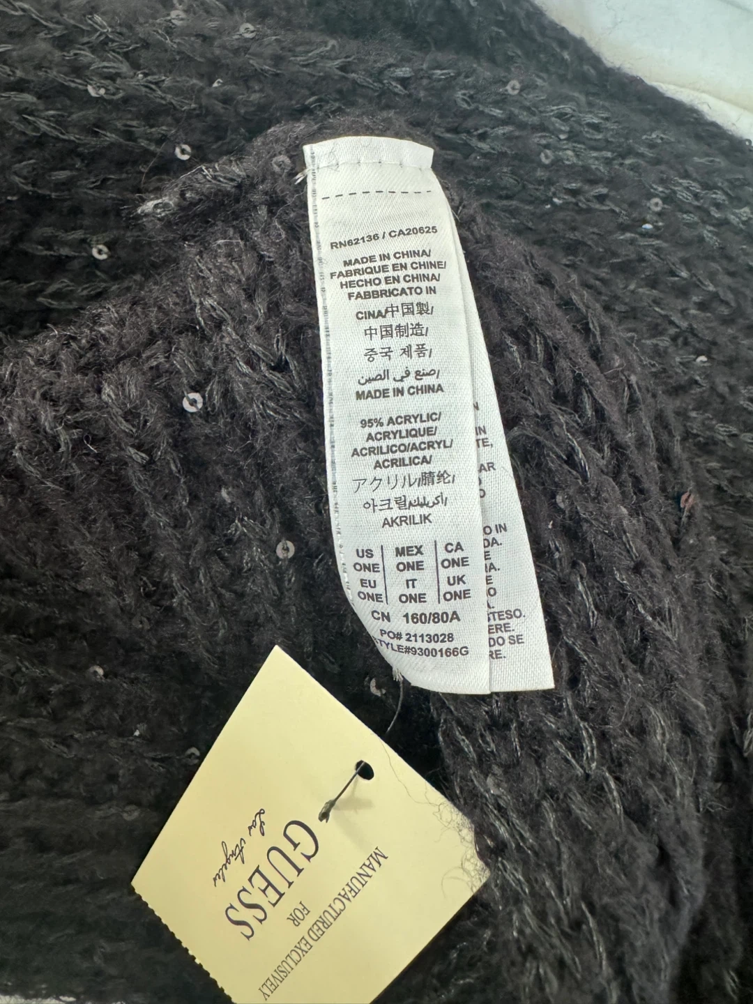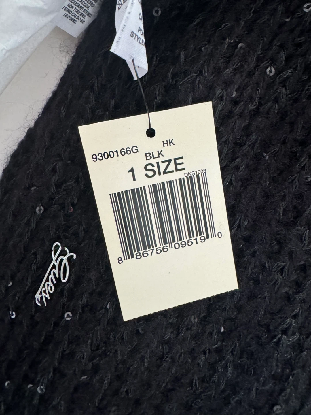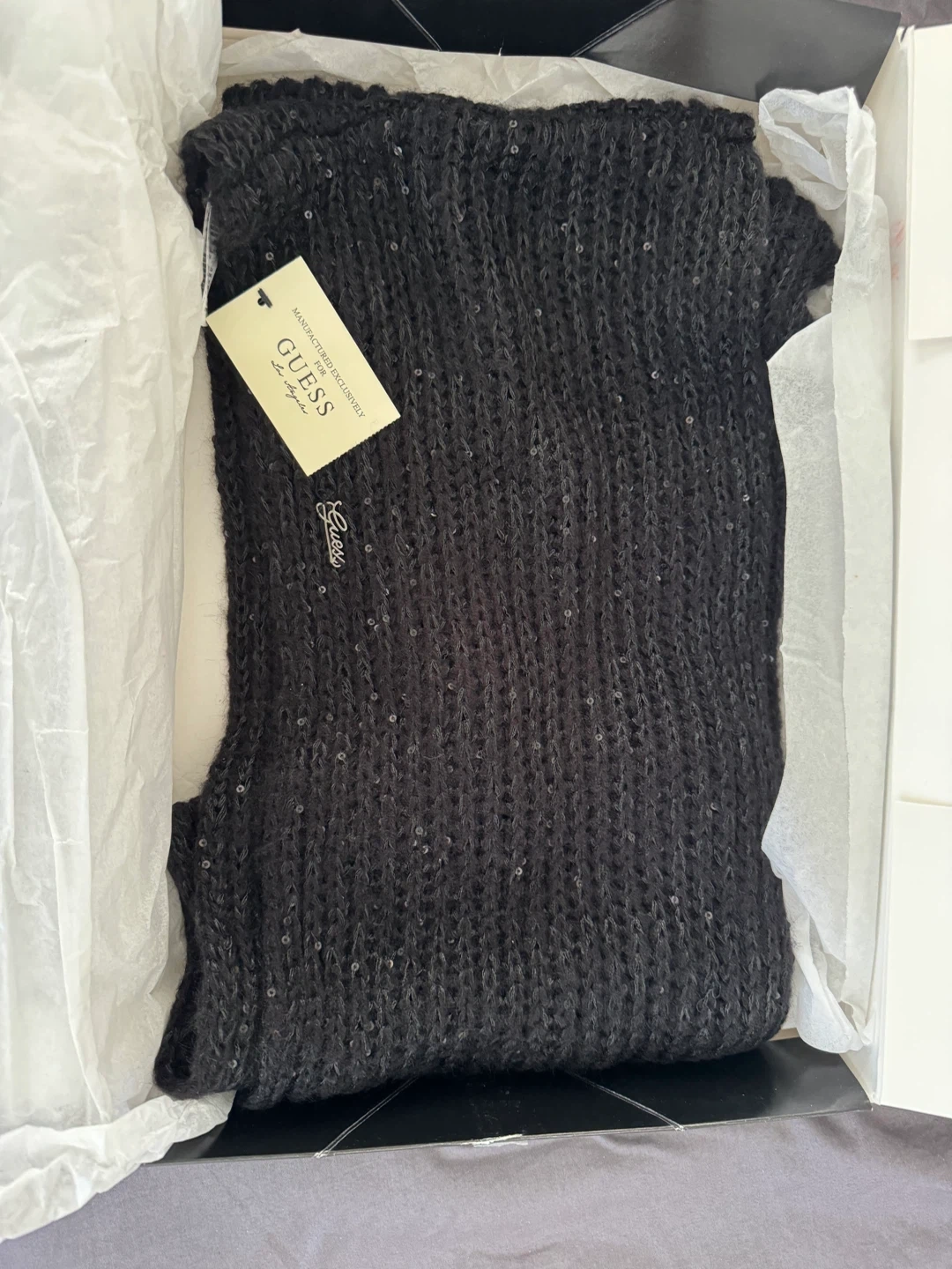 This is a brand new GUESS infinity scarf! It's black with sequins and comes in one size. The material is 95% acrylic. It comes with the original box