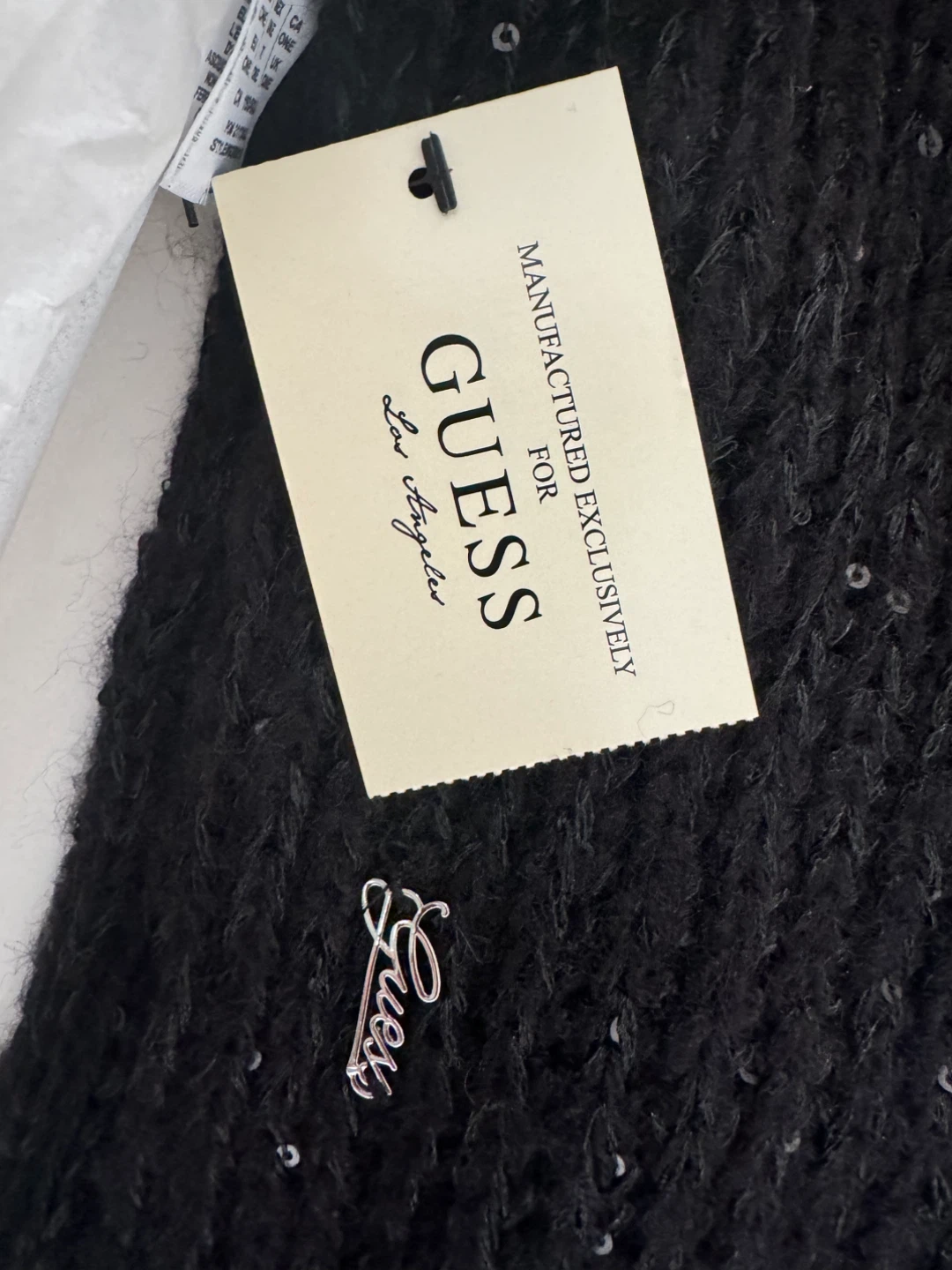 This is a brand new GUESS infinity scarf! It's black with sequins and comes in one size. The material is 95% acrylic. It comes with the original box