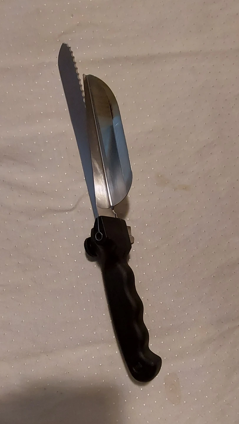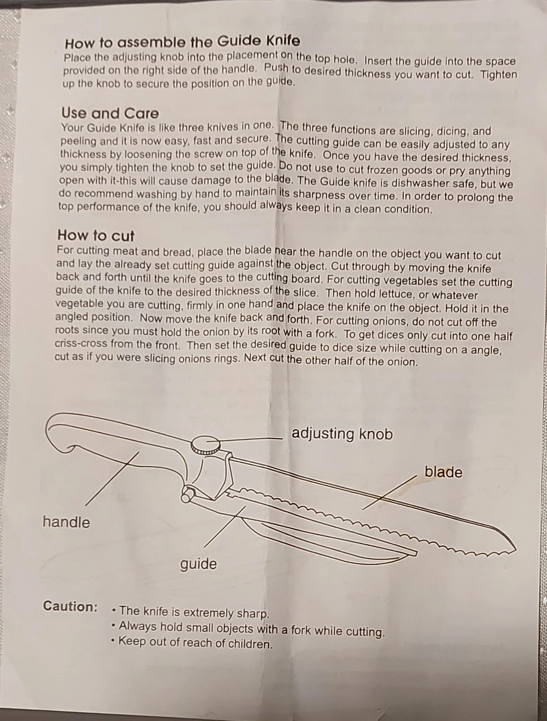 Your Guide Knife is like three knives in one, and it's easy to use! It's dishwasher safe for convenient cleaning. This knife is useful for slicing, dicing, and peeling all sorts of foods.