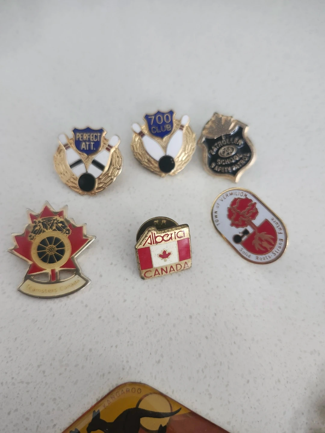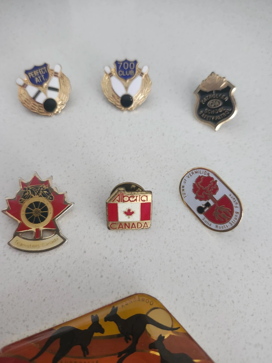 This lot includes several collectible pins featuring bowling themes, 'Alberta CANADA', 'Teamsters Canada', and 'Town of Vermilion'. It also comes with a boomerang-shaped keychain with Australian imagery. Great for collectors!