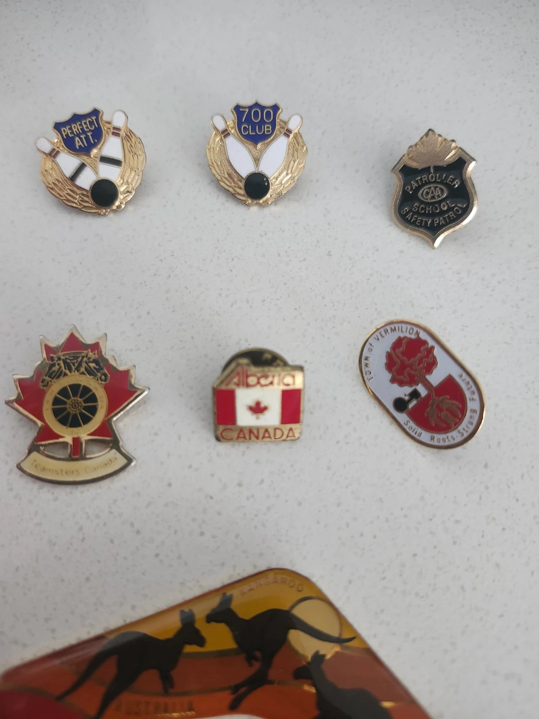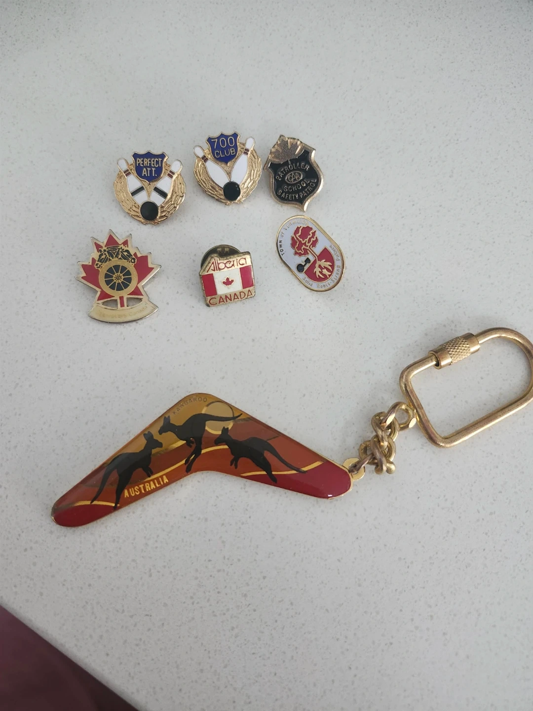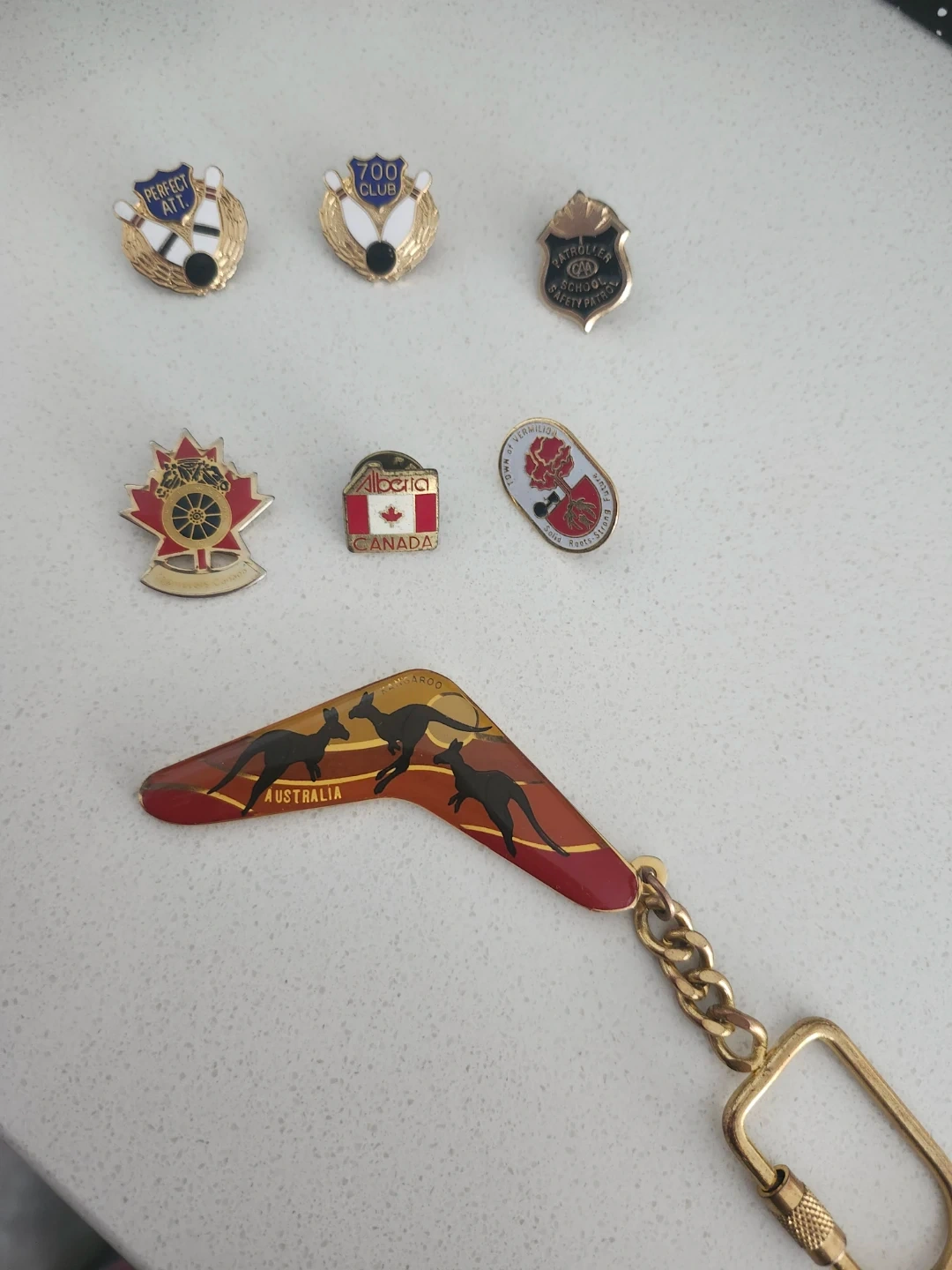 This lot includes several collectible pins featuring bowling themes, 'Alberta CANADA', 'Teamsters Canada', and 'Town of Vermilion'. It also comes with a boomerang-shaped keychain with Australian imagery. Great for collectors!