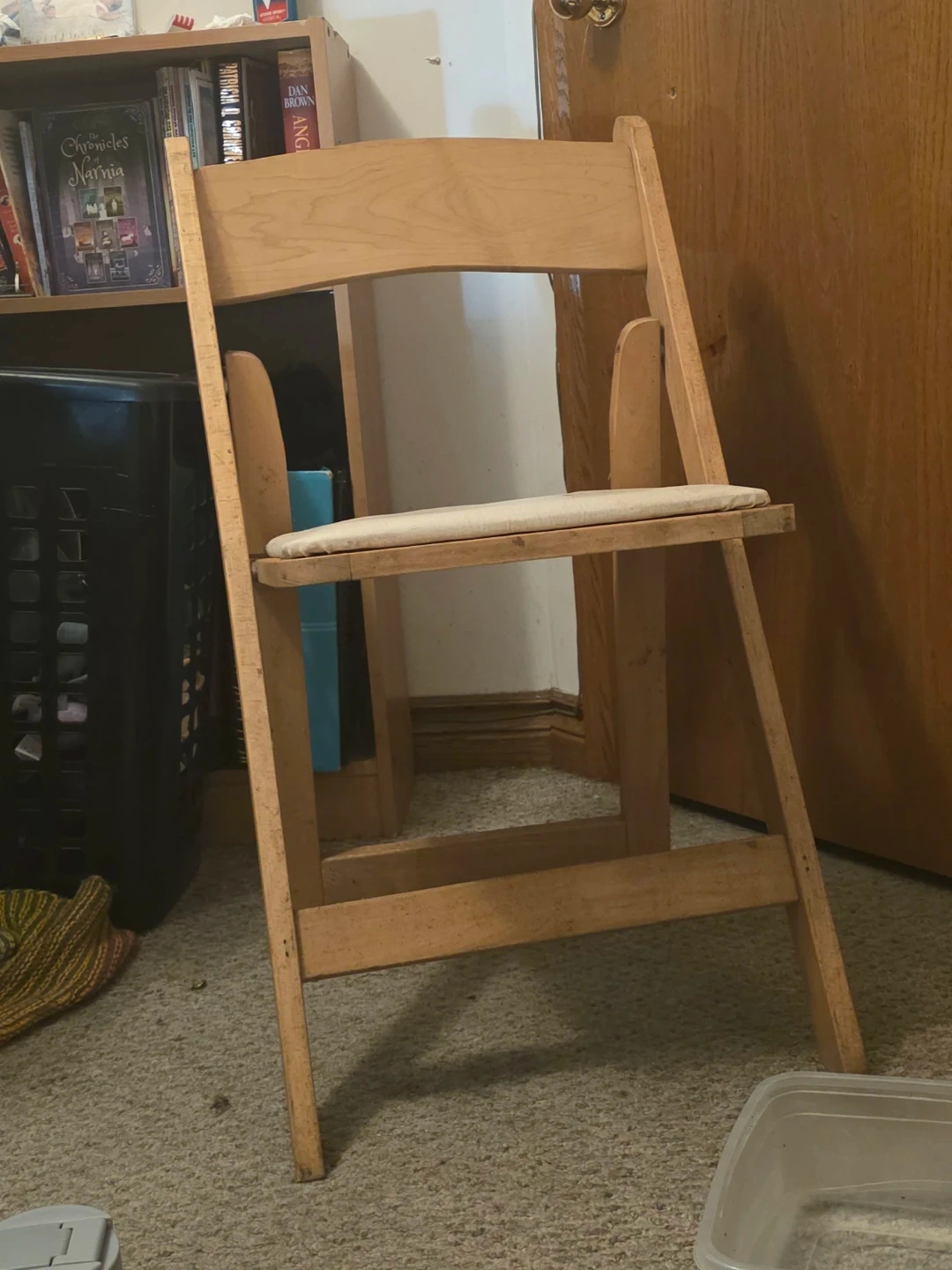 A simple wooden folding chair with a beige padded seat. It's made of light-coloured wood and folds flat for easy storage. Perfect for extra seating when you need it! 4 available 🥕