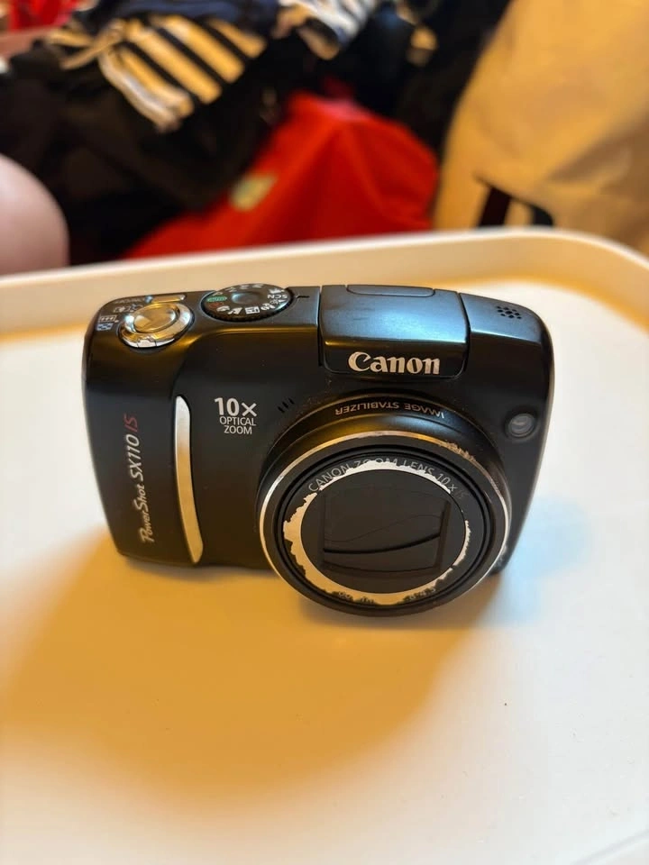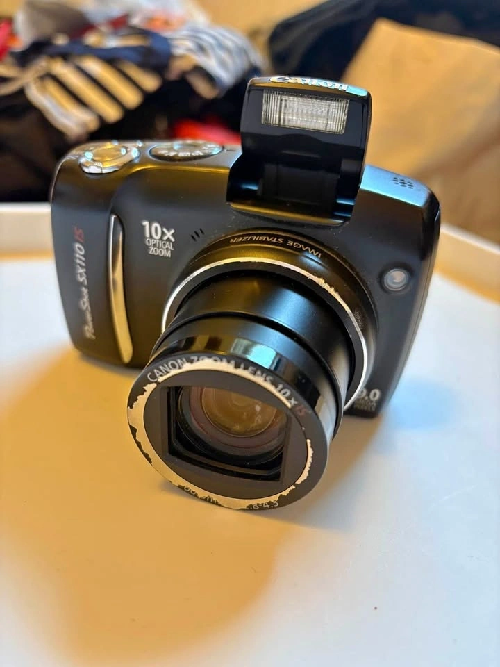 Canon Powershot SX110 IS. Photo samples at the end. Batteries, memory card, and case included. The only flaw is chipping around the lens, but it does not affect the quality of the camera.