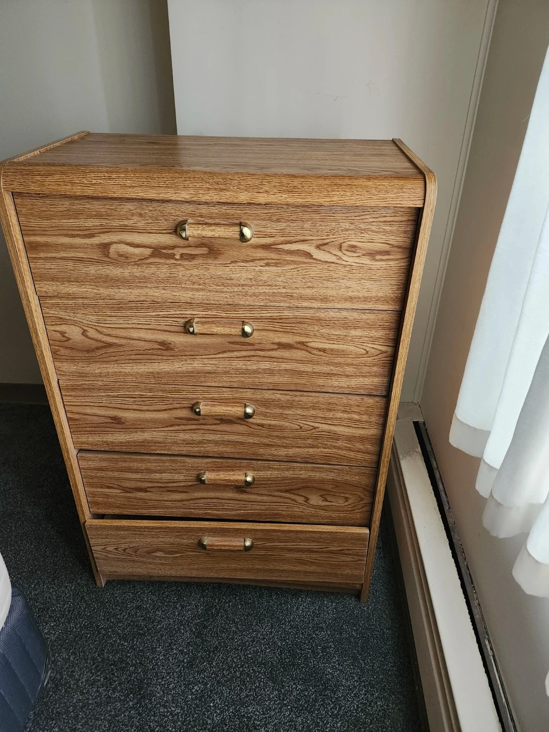 This dresser has a wood-grain finish and five drawers for storage. Each drawer has a brass-toned handle. It's a solid piece for organizing clothes or linens. 45.5in. h X 30in. w X 17.25in. d