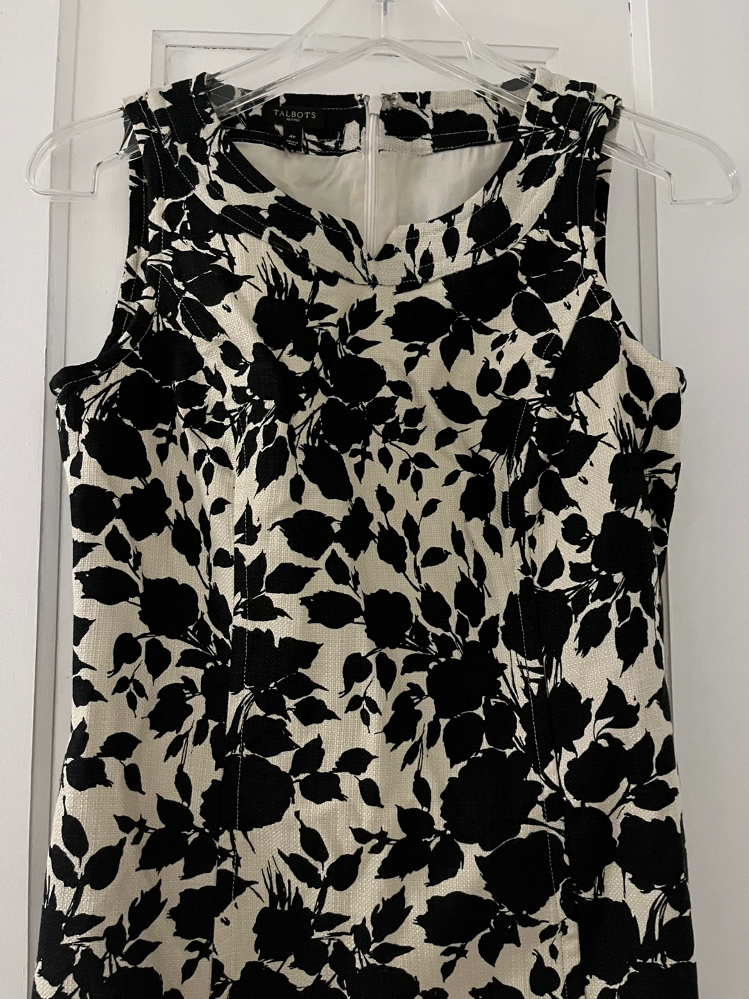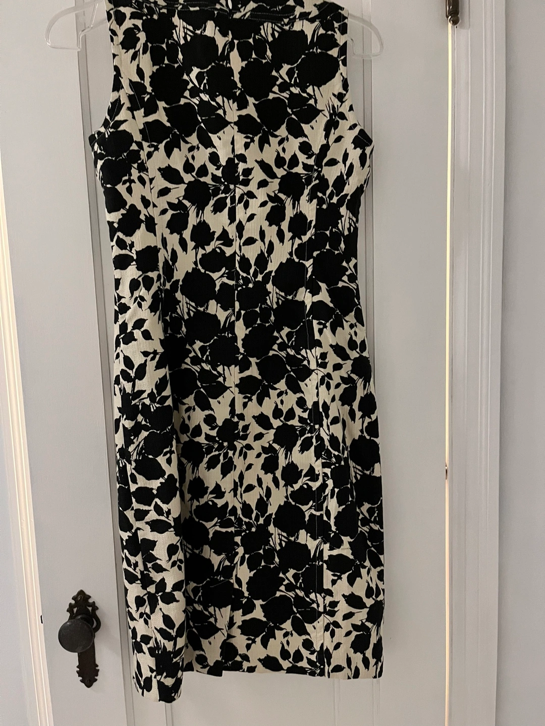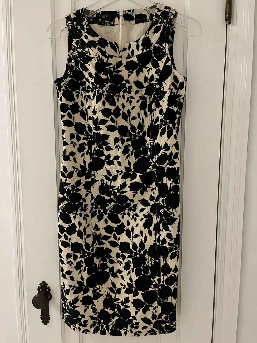 Sleeveless dress with black floral pattern on a cream background. Fitted. Zipper closure in back.