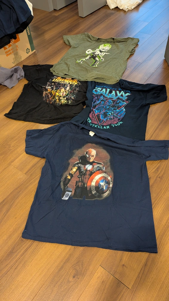 Four graphic t-shirts featuring Marvel characters. Includes Groot, Avengers, Guardians of the Galaxy, and Captain America designs. Adult sizes XL