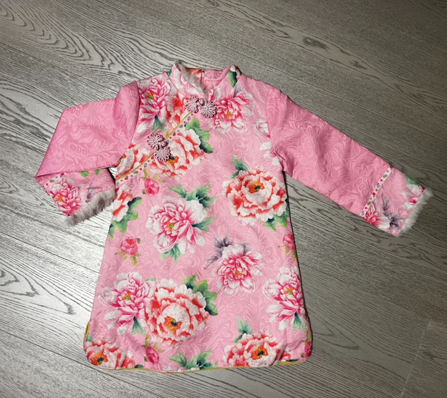 This is a pretty pink dress for a little girl with a beautiful floral print. It features a traditional Chinese style with a mandarin collar and frog button closures. The sleeves have a fuzzy trim for added flair. It's perfect for special occasions or cultural celebrations!