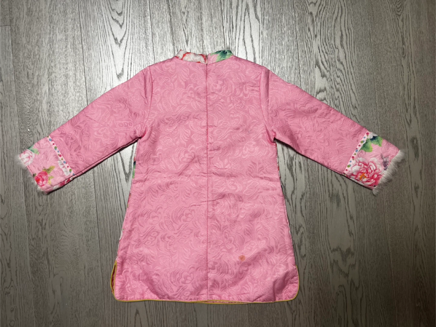 This is a pretty pink dress for a little girl with a beautiful floral print. It features a traditional Chinese style with a mandarin collar and frog button closures. The sleeves have a fuzzy trim for added flair. It's perfect for special occasions or cultural celebrations!