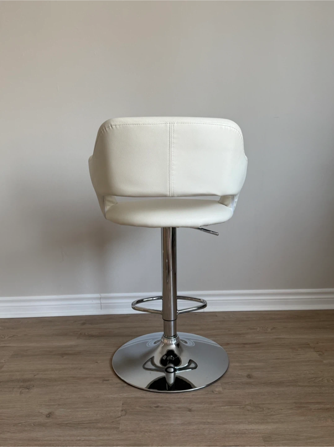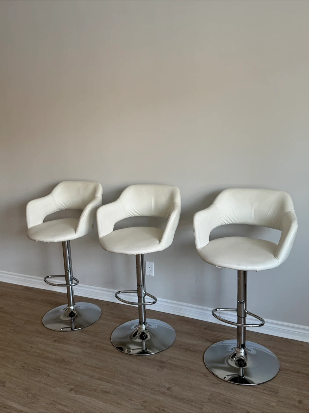Adjustable height bar stools with chrome base and footrest. Upholstered in white faux leather. These chairs feature a supportive backrest and comfortable seat. Perfect for a home bar or kitchen island!