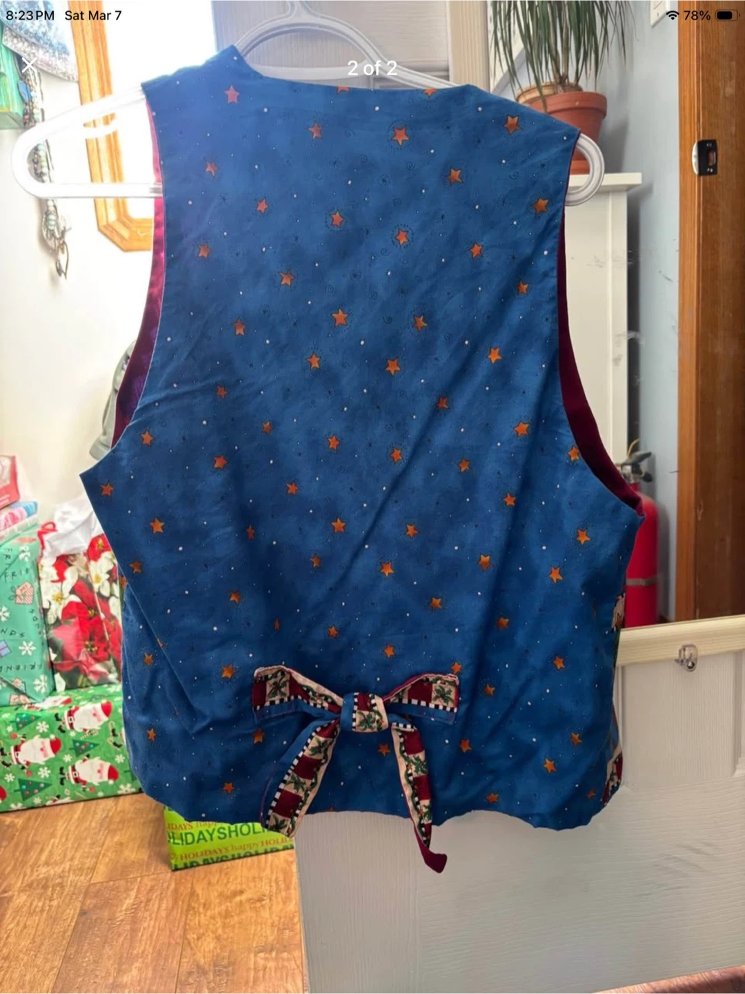 This handmade ladies vest features a blue starry night pattern on one side, and a festive Christmas scene with Santa, reindeer, and angels on the other. It's adorned with a cute bow detail at the back. Perfect for holiday gatherings!