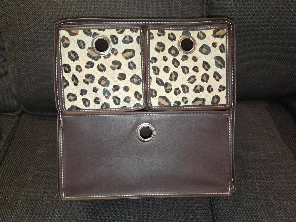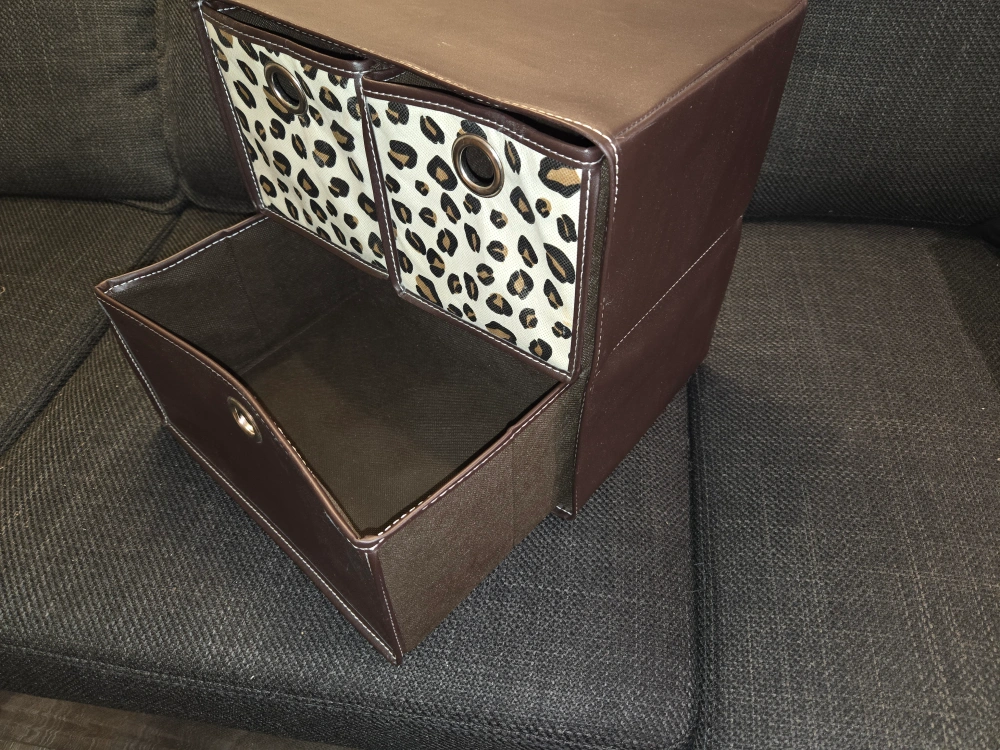 Here's a cute storage box that's perfect for organizing your space! It has a brown faux leather exterior with two leopard print drawers on top and a larger drawer at the bottom. It's in great condition and is perfect for keeping your space tidy and fun. Also fits nicely into a cube storage unit or beautifuly on a floor, desk, or ottoman.
