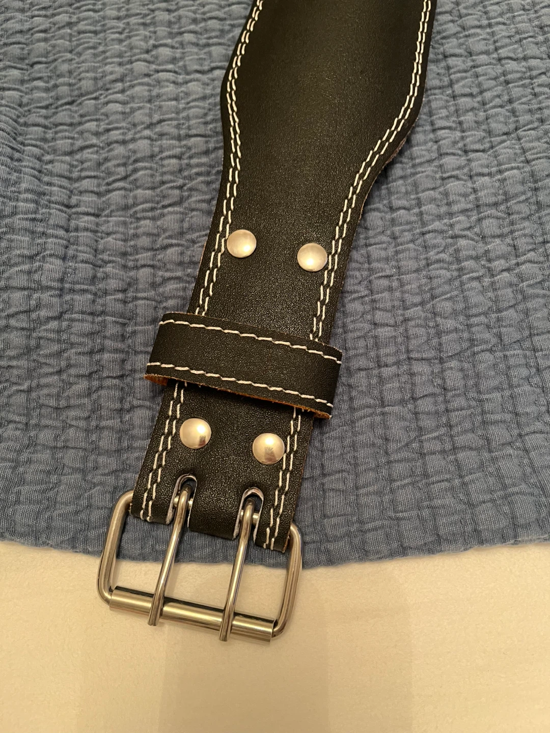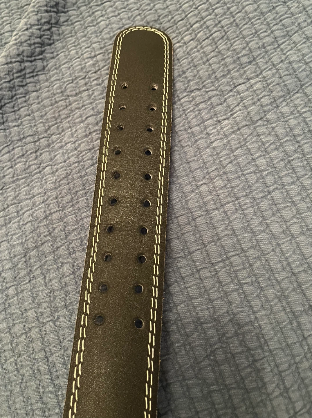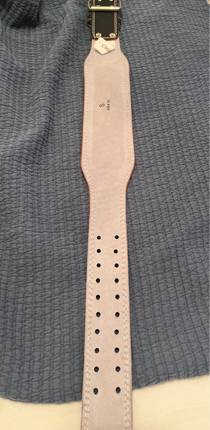 This is a Grizzly Fitness weightlifting belt. It's a size small and made of genuine leather and polyurethane foam. The belt is black with white stitching and a double prong buckle.