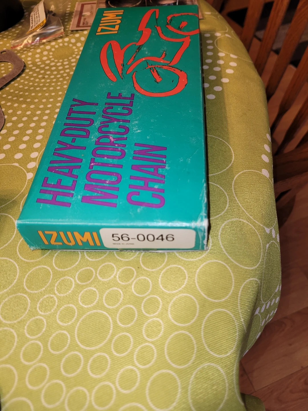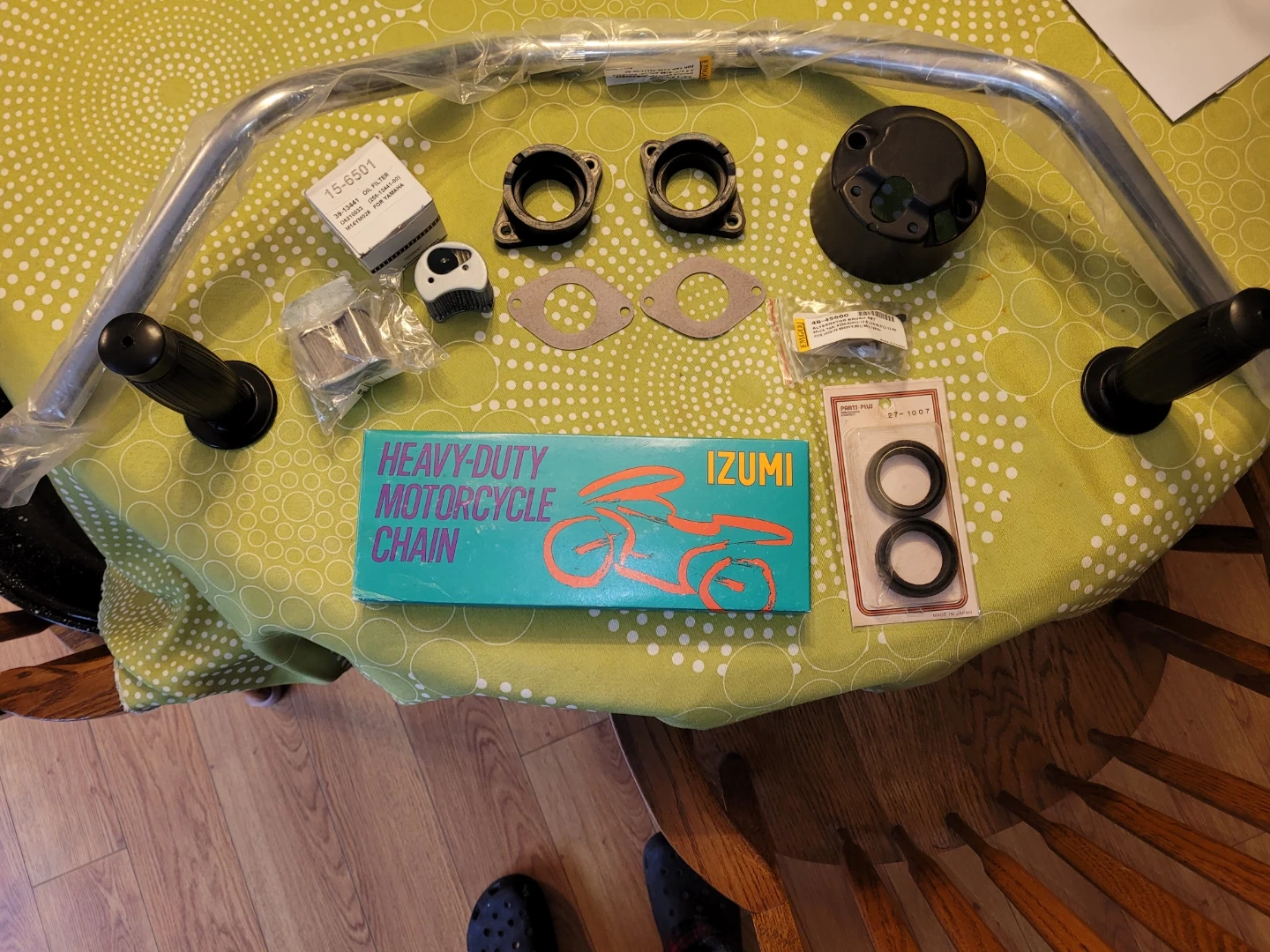 IZUMI heavy-duty motorcycle chain. Chain size ES 530 HT with 104 links. Made in Japan. Handle bars are 7/8" 30 1/2" (W) x 4 3/4" rise and 10" pullback for Yamaha. Made in Taiwan. Includes grips and other assorted motorcycle parts.