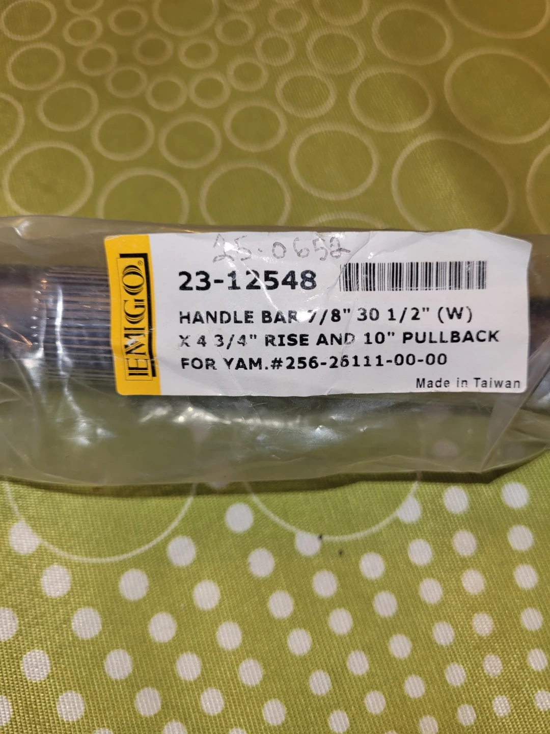 IZUMI heavy-duty motorcycle chain. Chain size ES 530 HT with 104 links. Made in Japan. Handle bars are 7/8" 30 1/2" (W) x 4 3/4" rise and 10" pullback for Yamaha. Made in Taiwan. Includes grips and other assorted motorcycle parts.