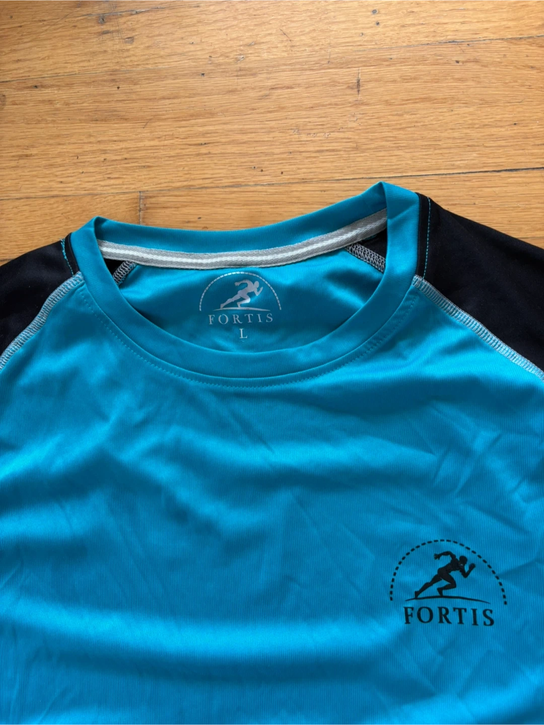 Fortis athletic t-shirt in blue and black. Size large. It's made for active wear.