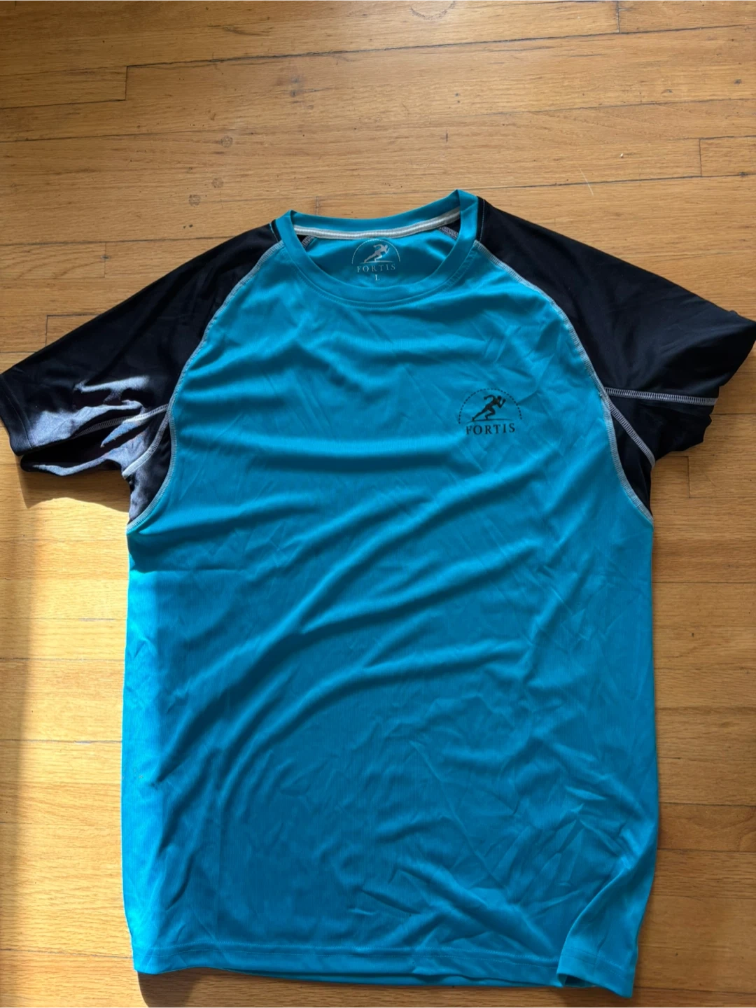 Fortis athletic t-shirt in blue and black. Size large. It's made for active wear.