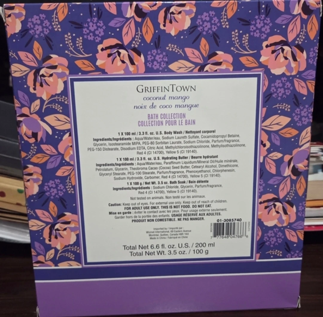 This bath collection set features coconut mango scented body wash and hydrating butter. It also includes a bath soak. Makes a nice gift!