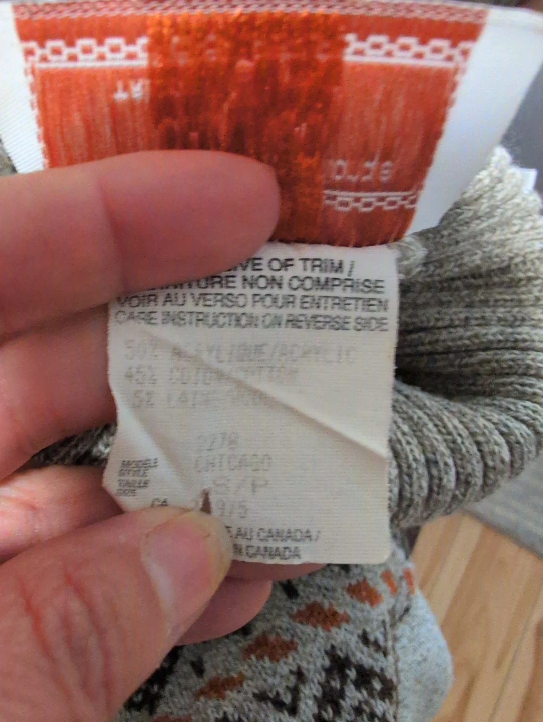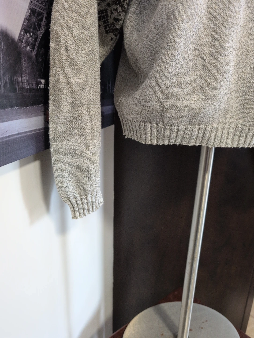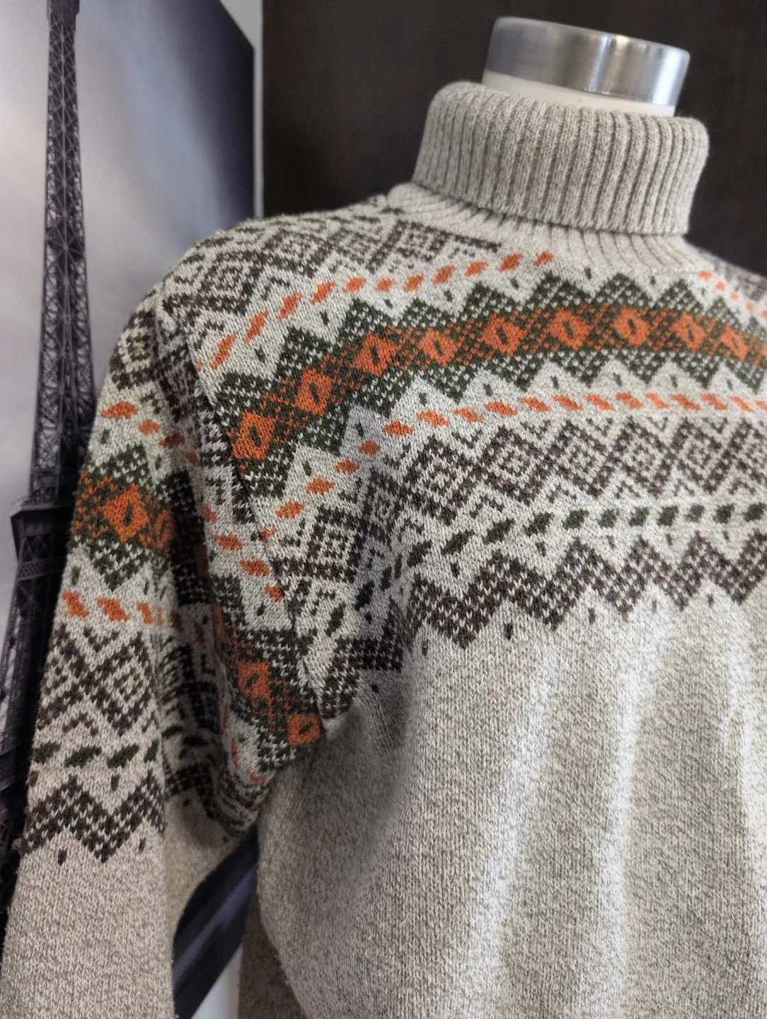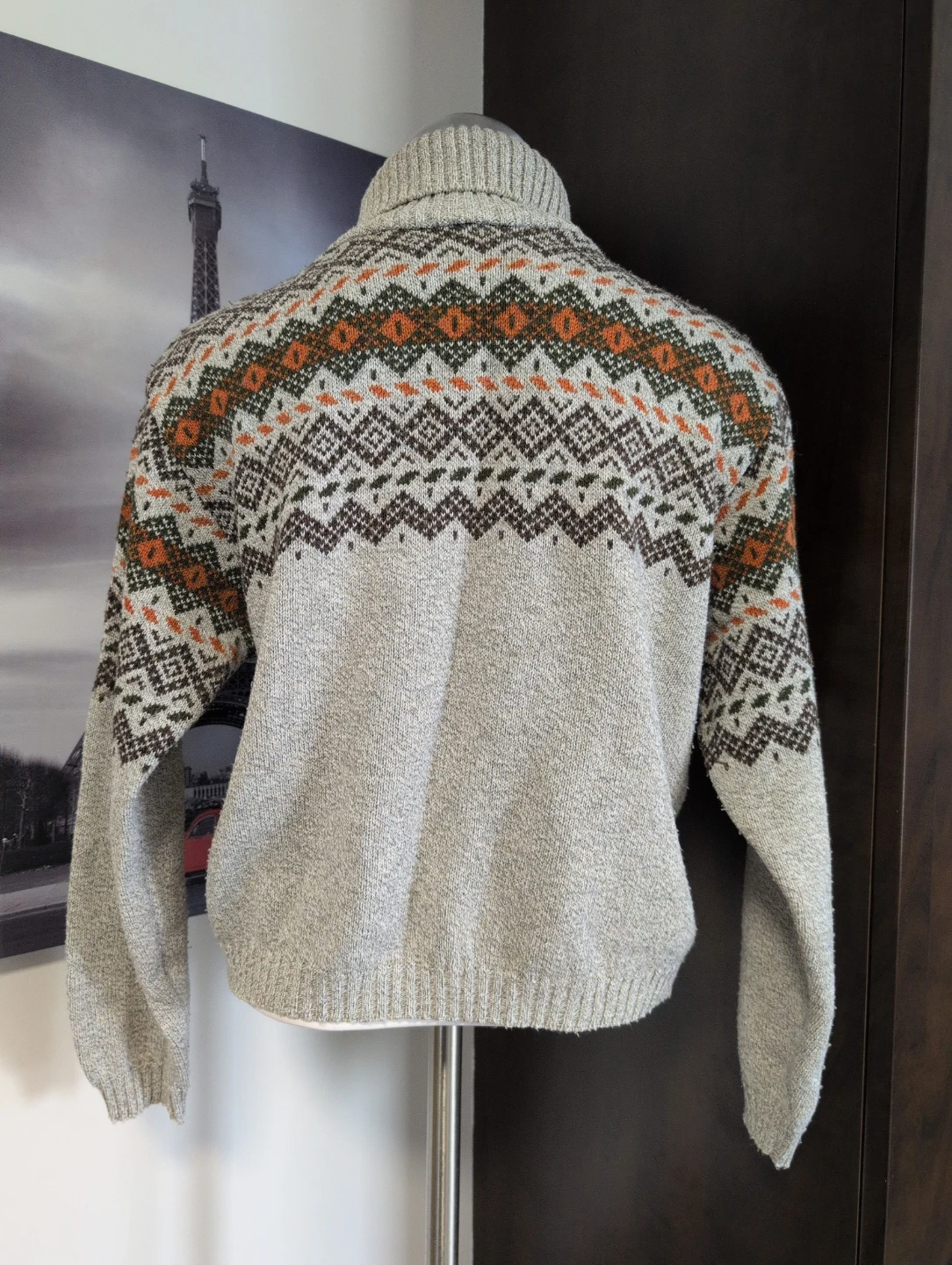 Cozy grey turtleneck sweater with a geometric fair isle pattern in orange and brown. It's a knit construction. Perfect for colder weather!