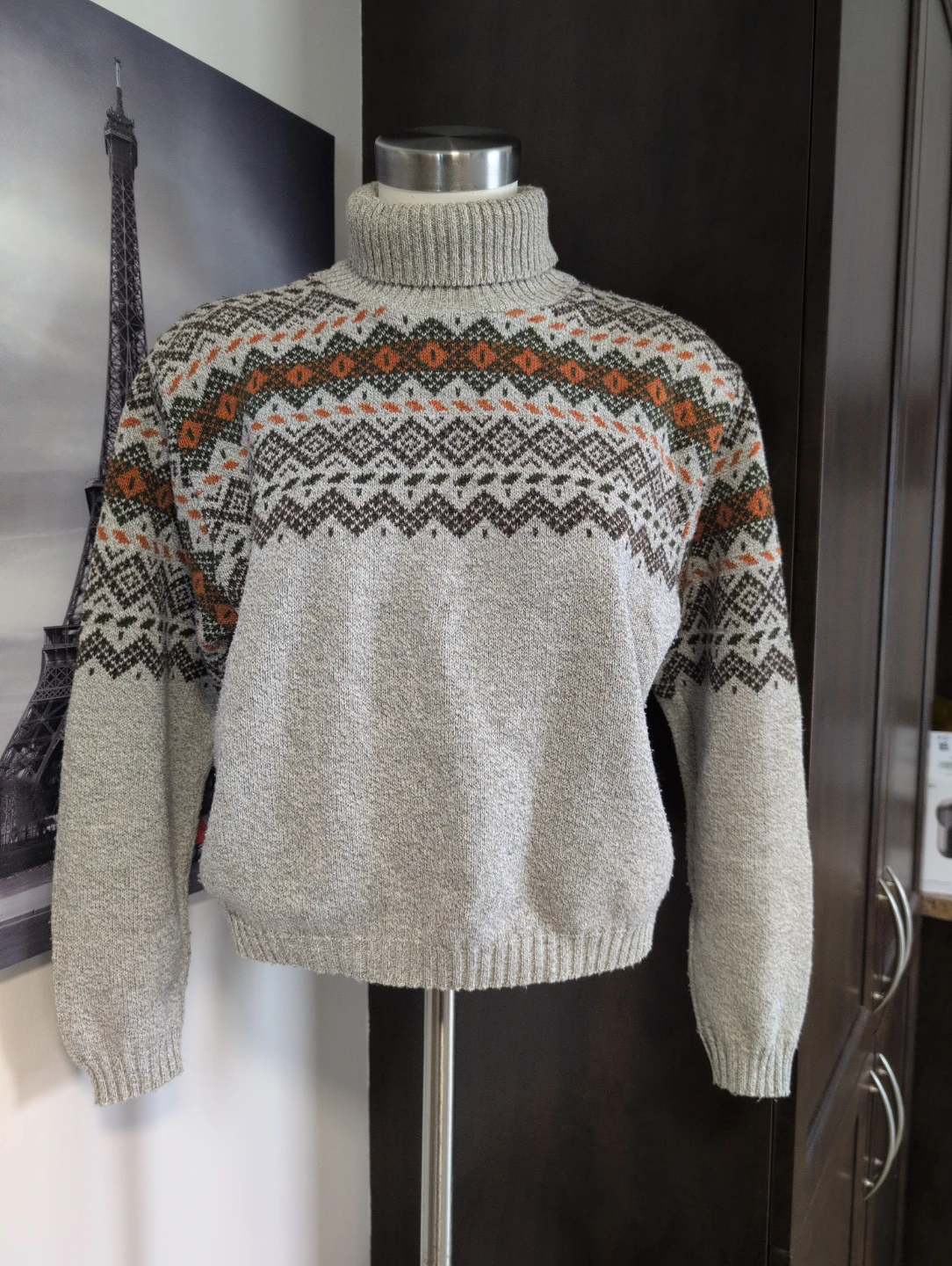 Cozy grey turtleneck sweater with a geometric fair isle pattern in orange and brown. It's a knit construction. Perfect for colder weather!