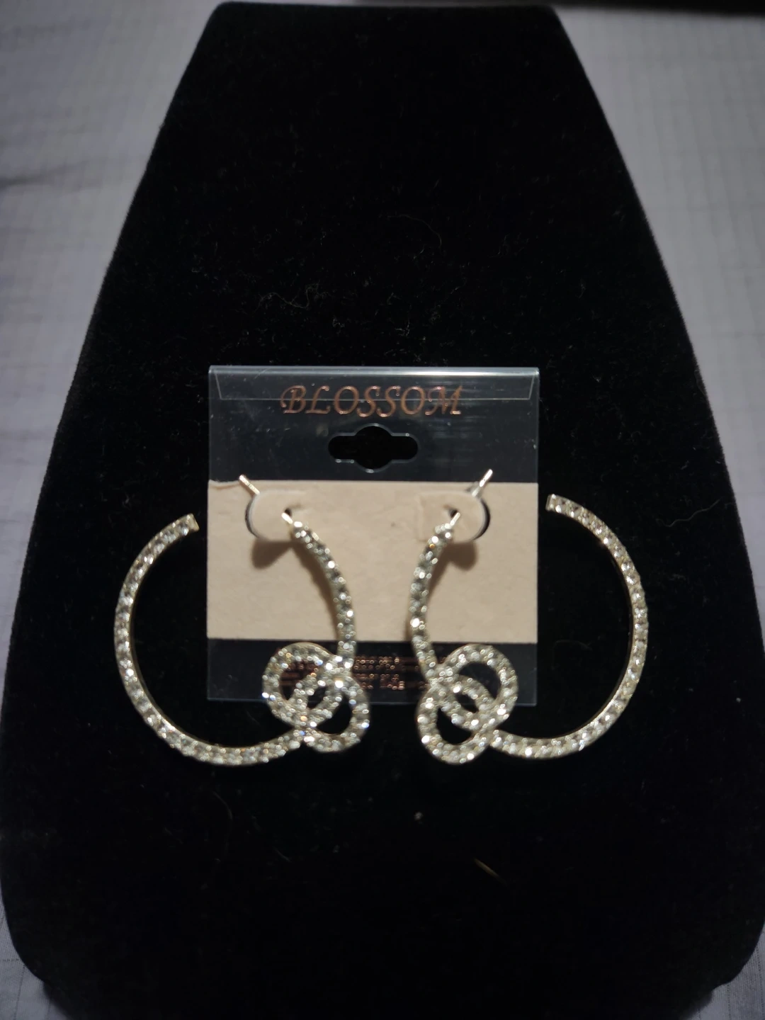 Sparkling hoop earrings featuring a knot design. These earrings are adorned with rhinestones for extra shine. They're lightweight and ready to add some glamour to your outfit!