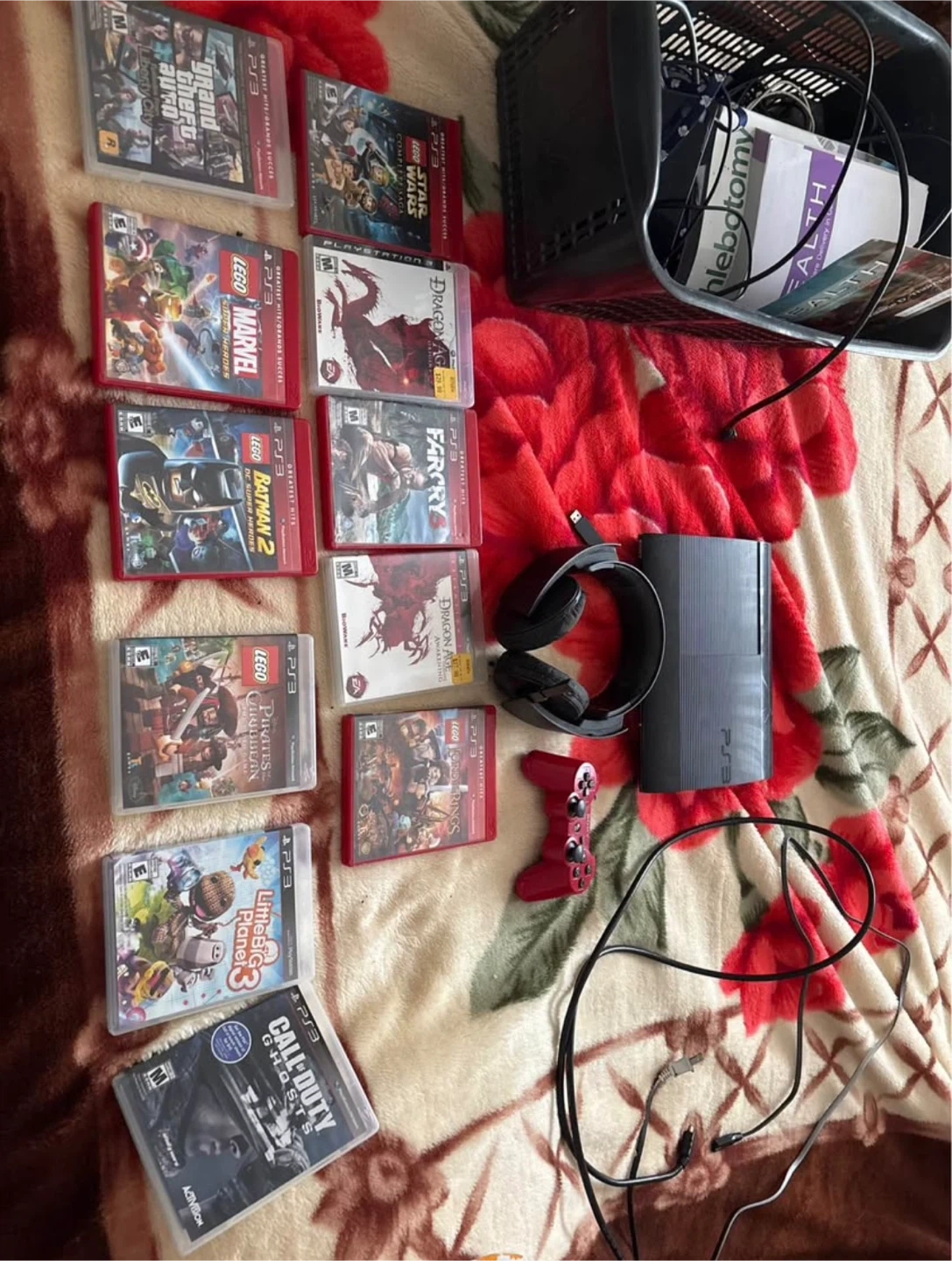 Selling a PlayStation 3 console along with a collection of games. It comes with a controller and headset. Games included are Grand Theft Auto, LEGO Marvel, LEGO Star Wars, Dragon Age, Far Cry 2, LEGO Batman 2, LEGO Pirates of the Caribbean, LittleBigPlanet 3, and Call of Duty: Ghosts. The console is a PS3 model.