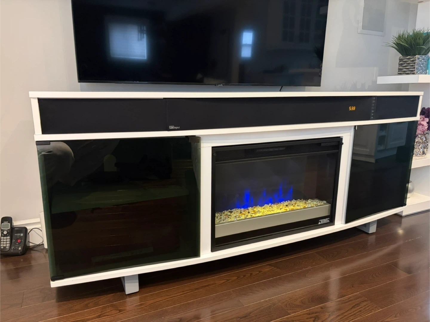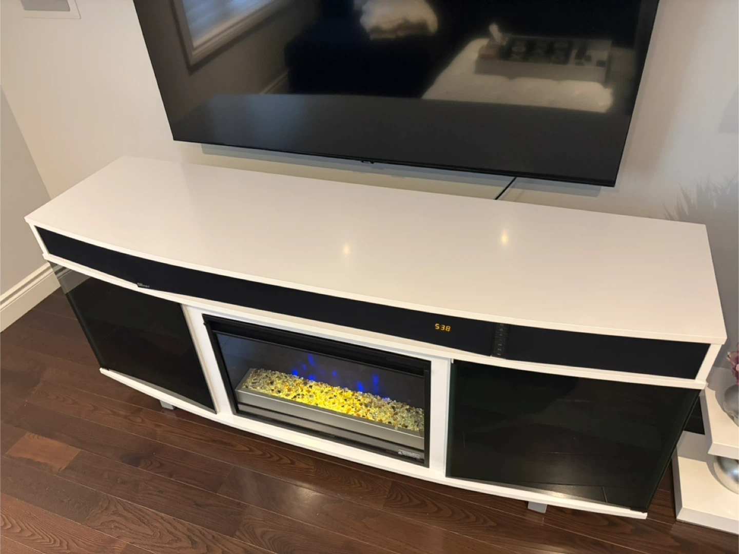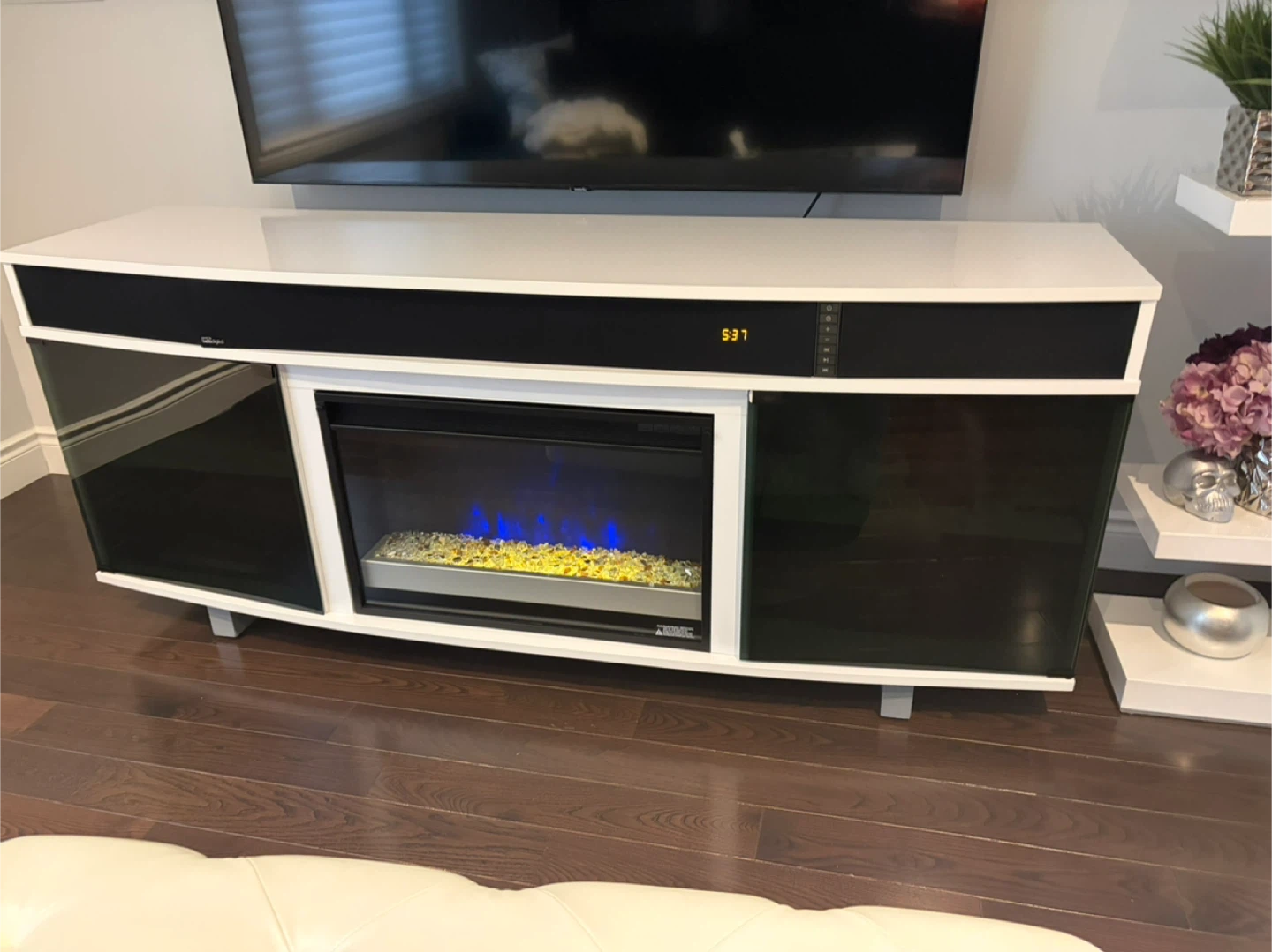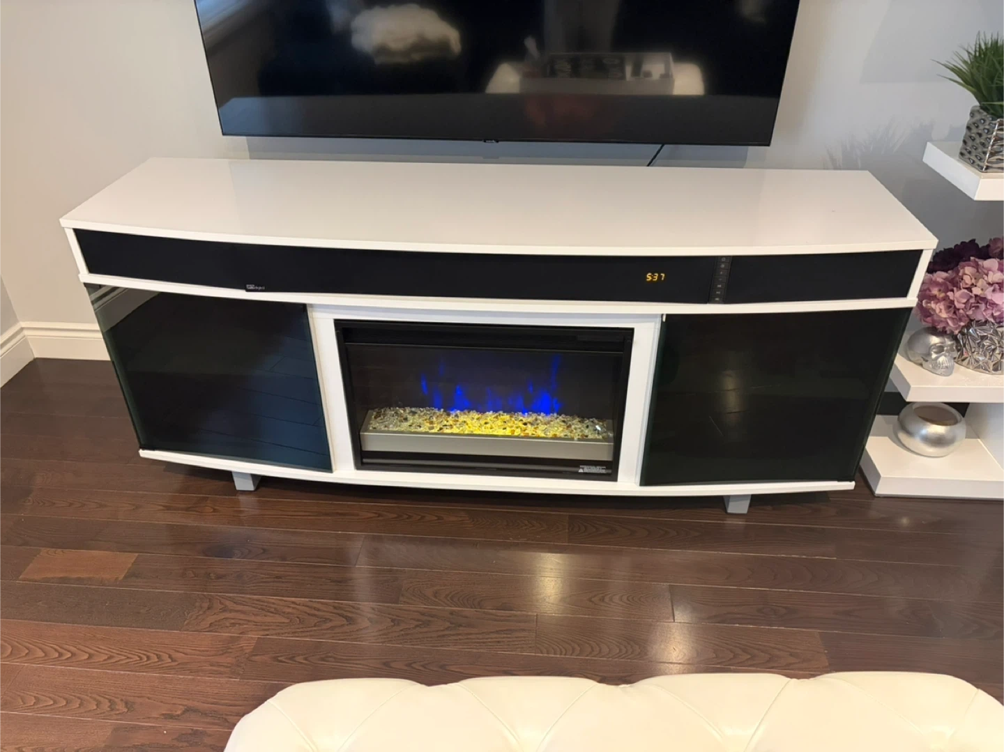 White gloss entertainment stand with integrated electric fireplace. Features two smoked glass cabinet doors on the sides and a soundbar above the fireplace. It's in excellent condition.