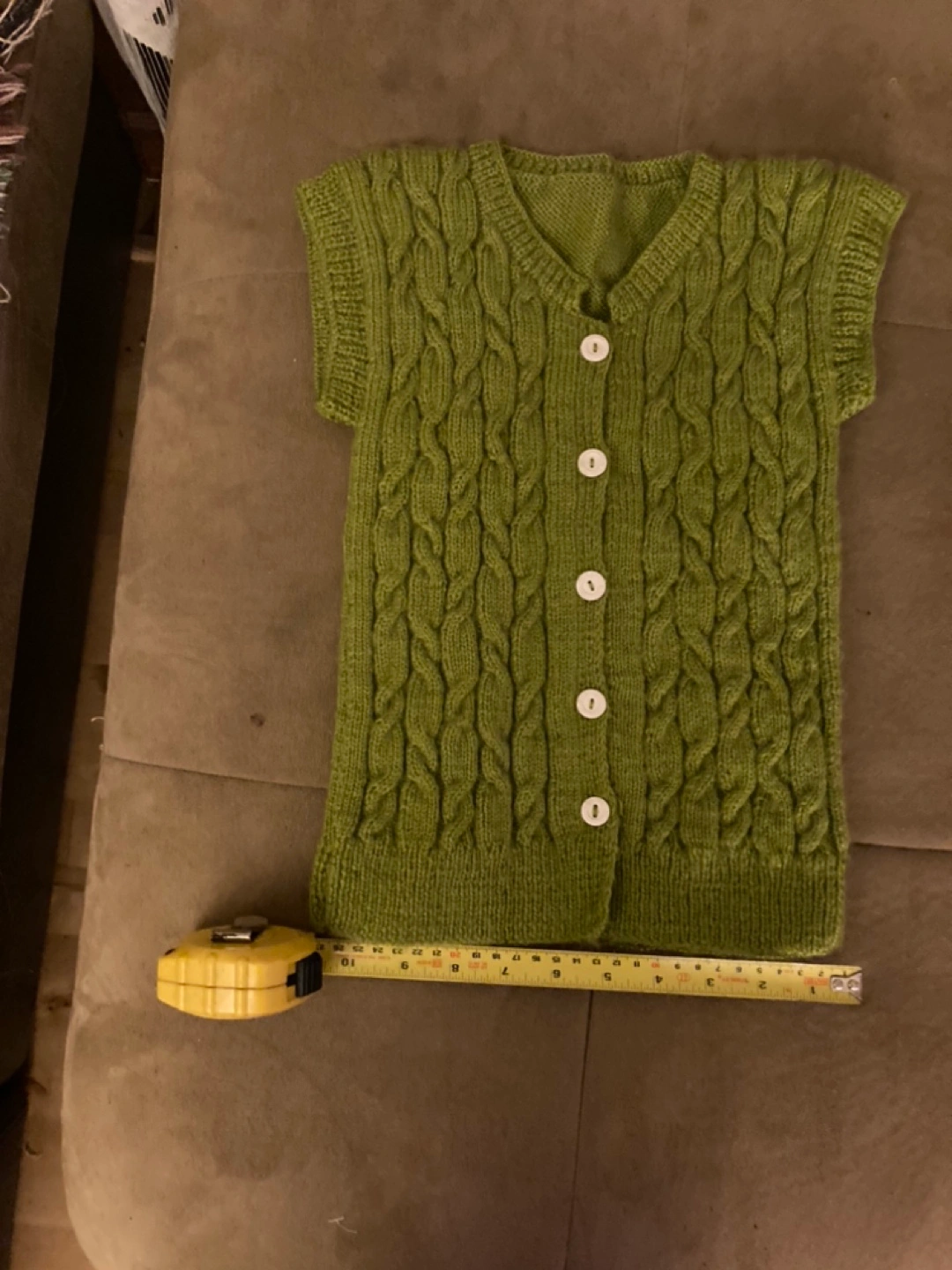 Green hand knit sleeveless sweater/vest for a child 2-3 yo. New. Beautiful green color. Button up front. One of a kind. Very soft, machine washable in cold water, $25