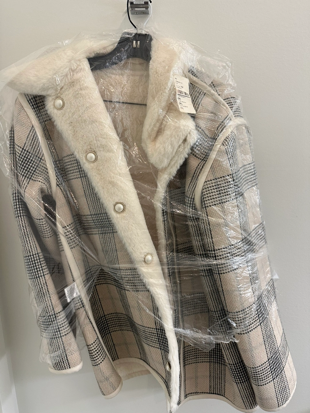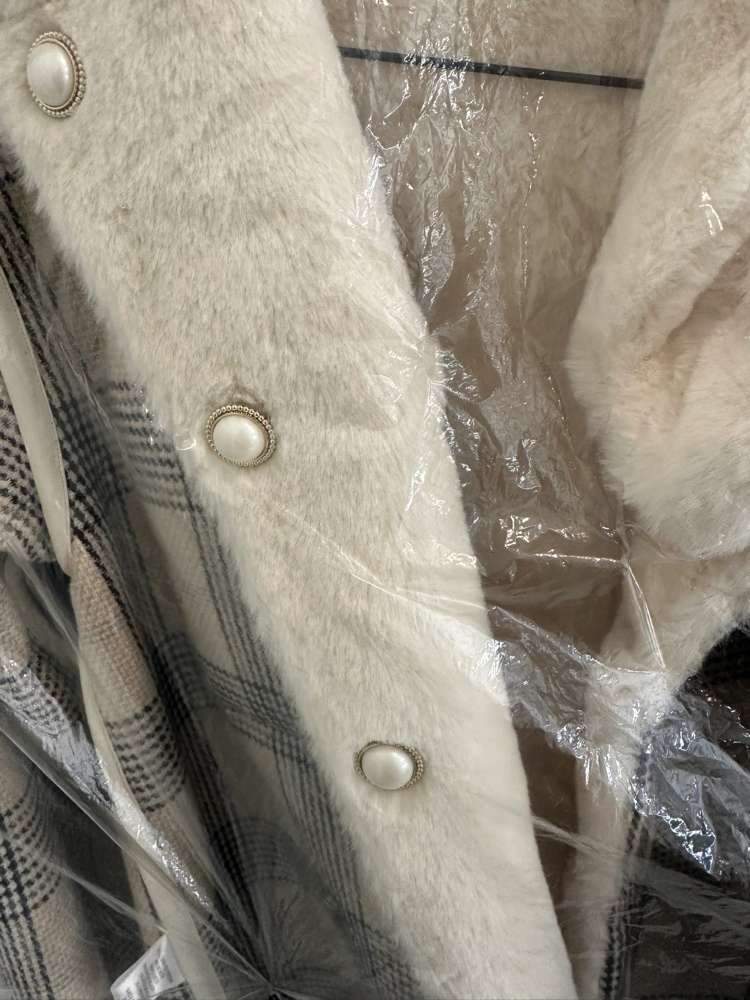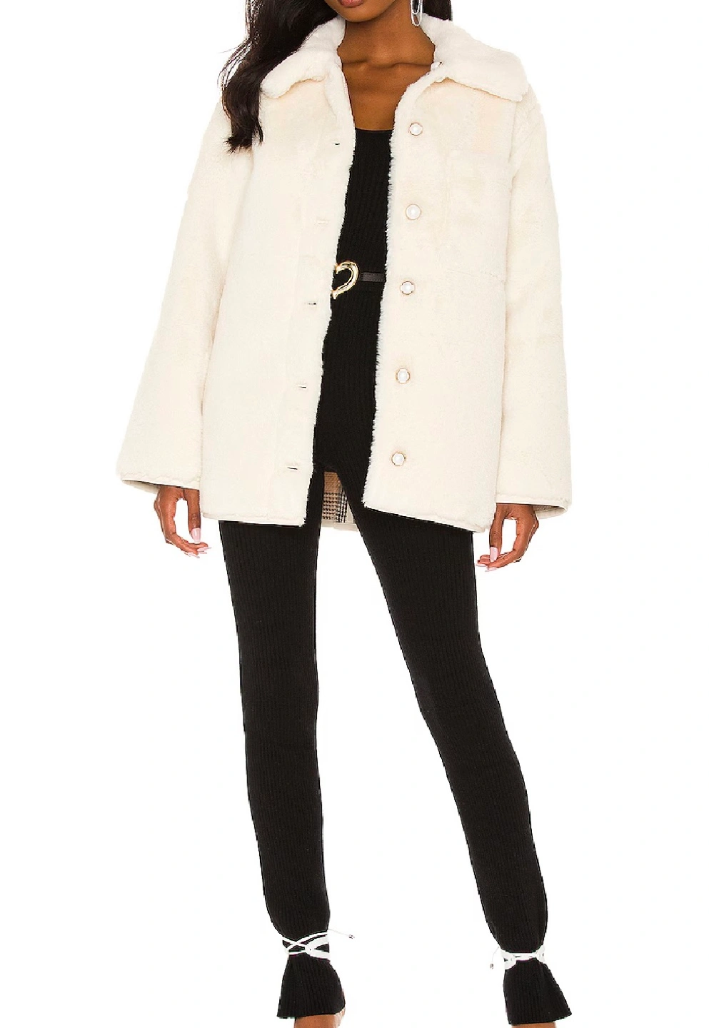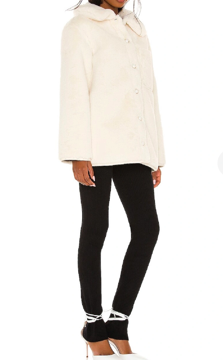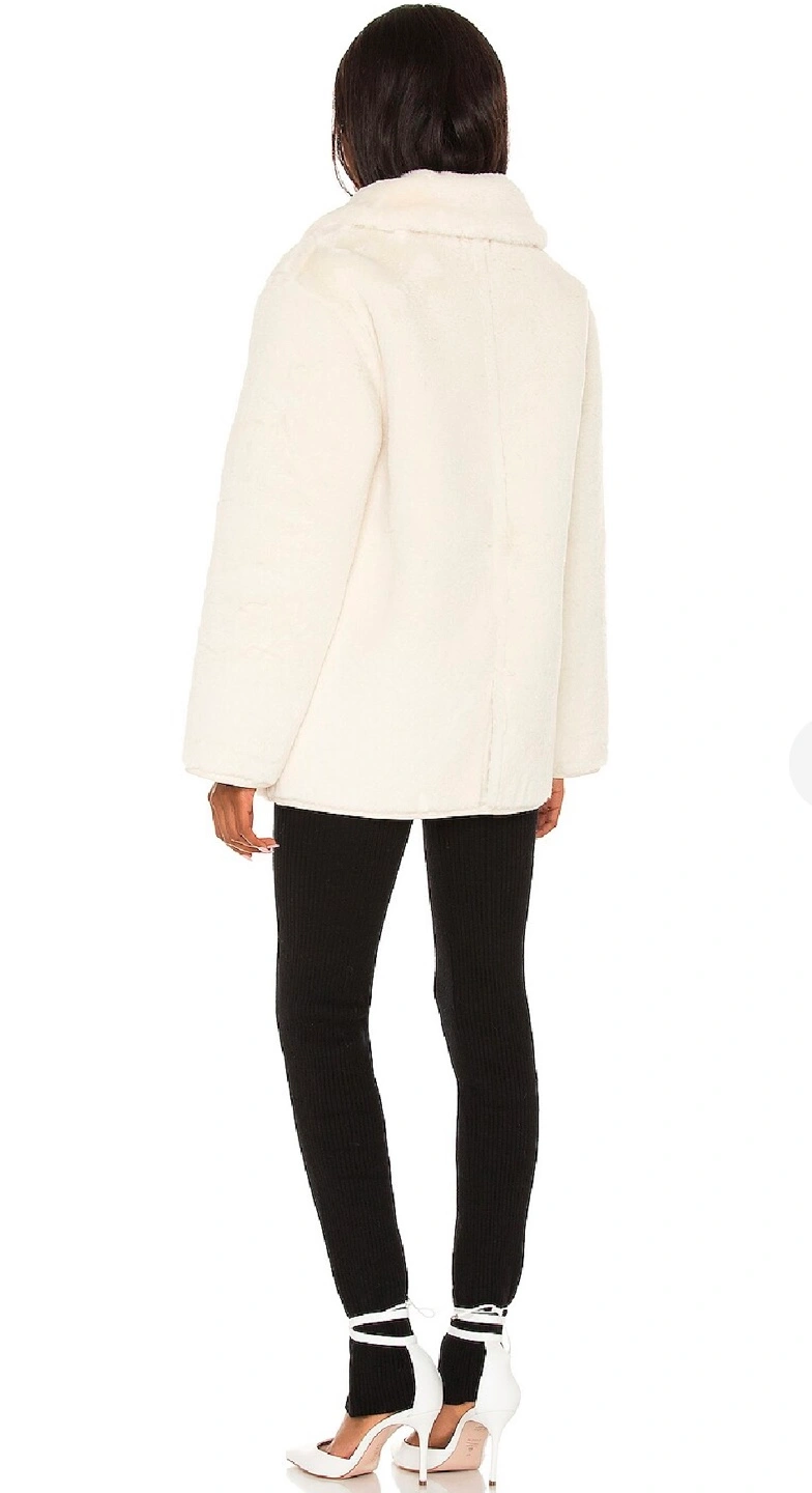 Cream coloured faux fur jacket. Features a collared neckline and button closure. Oversized fit. Pearl-like buttons. Soft and cozy.