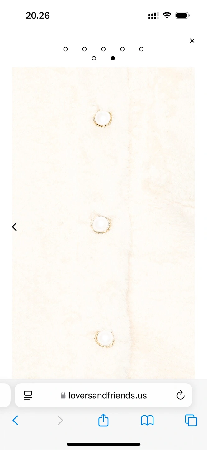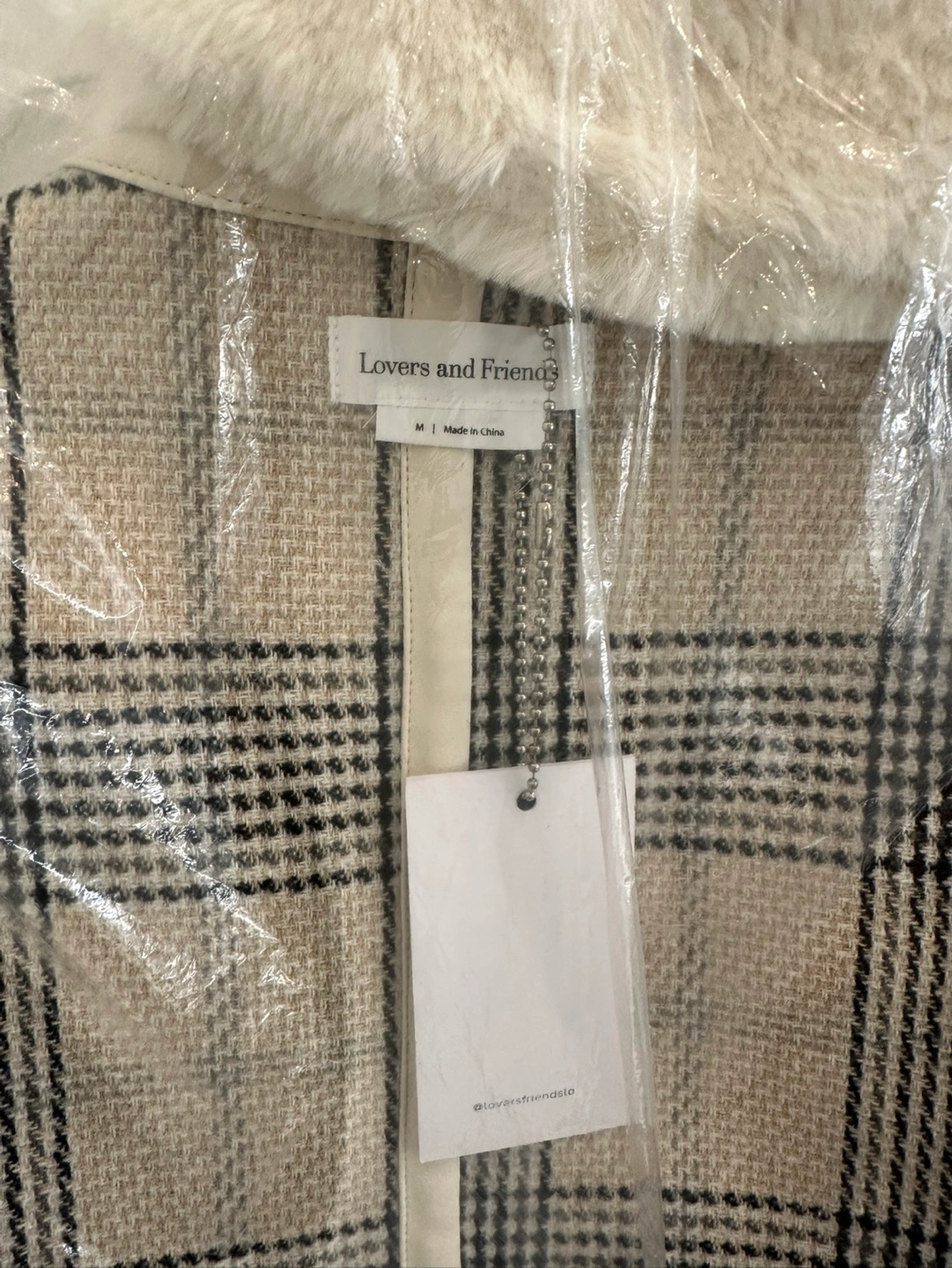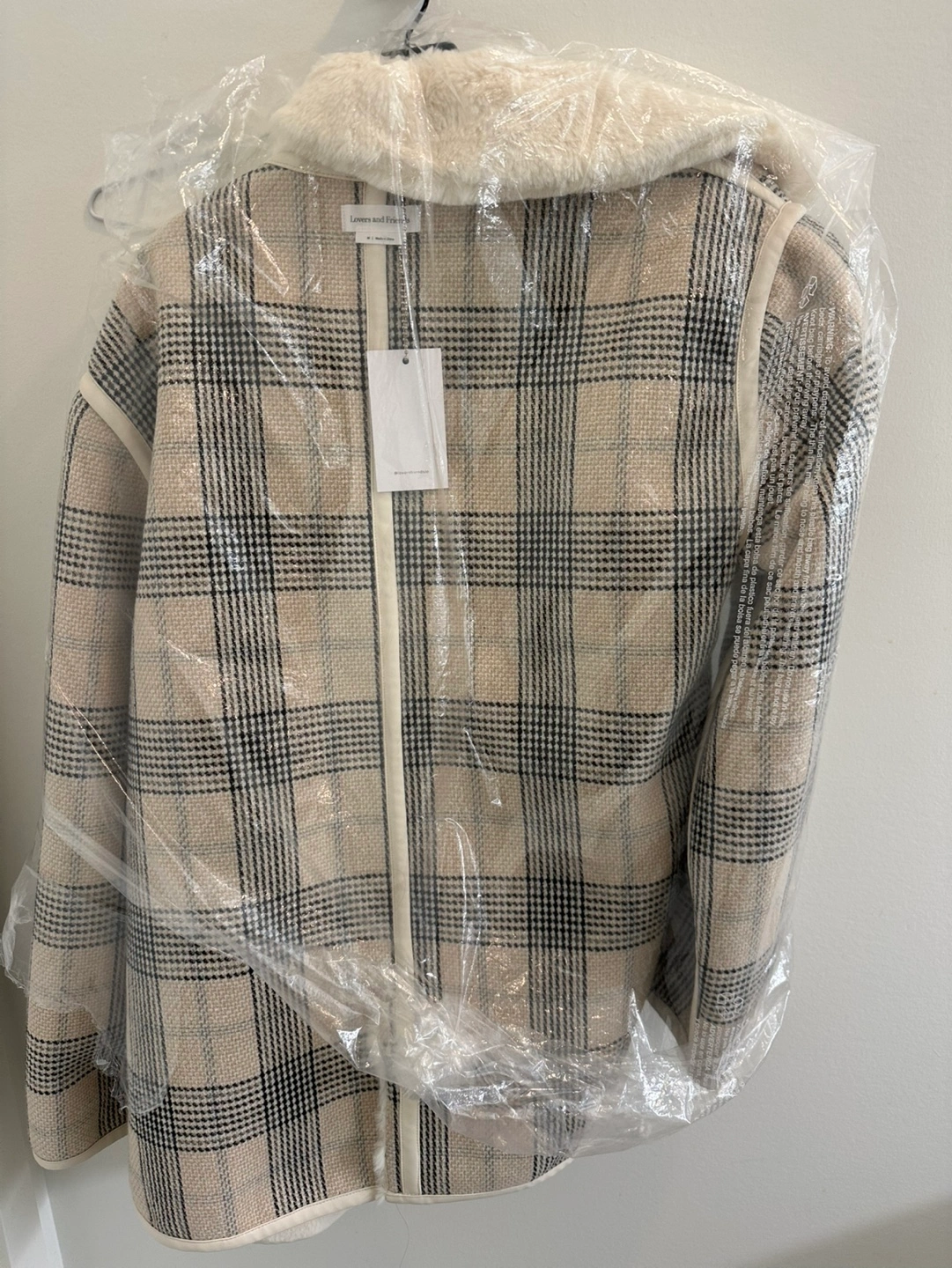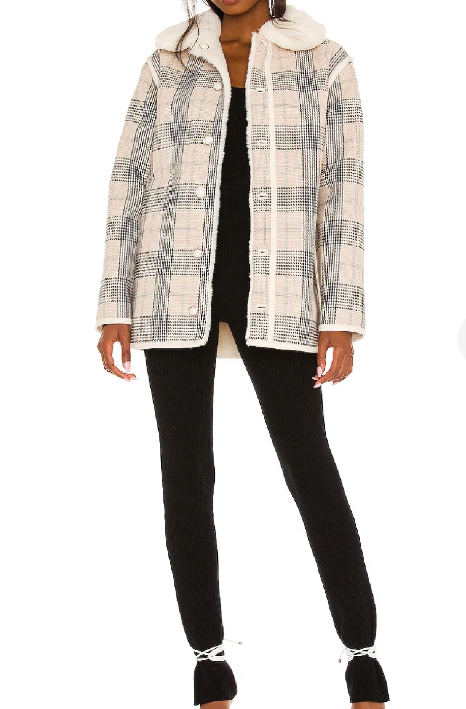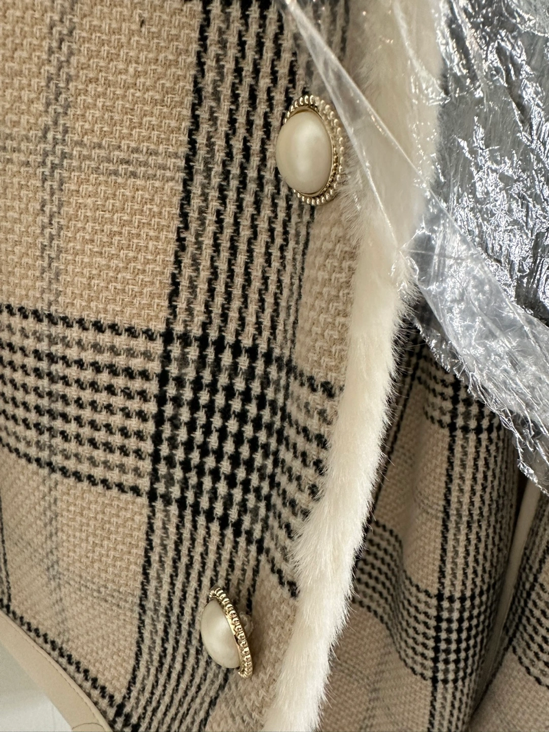 Cream coloured faux fur jacket. Features a collared neckline and button closure. Oversized fit. Pearl-like buttons. Soft and cozy.
