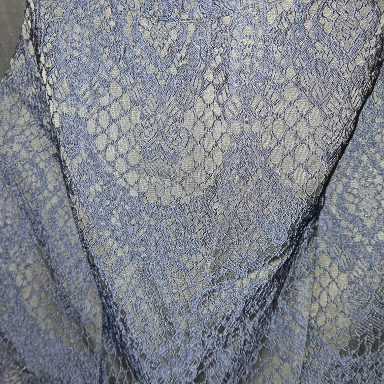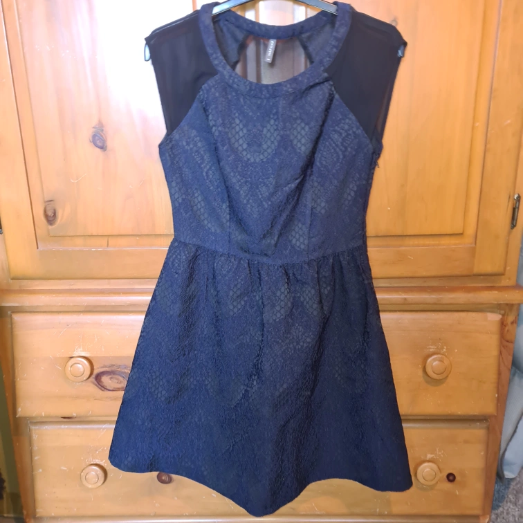 Mainly polyester (I think, the inside tag is unreadable) with sheer material on shoulders and back.